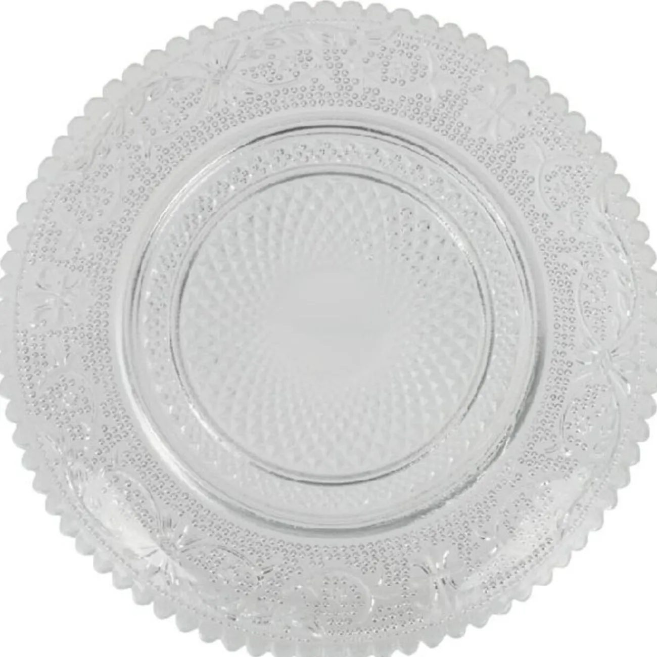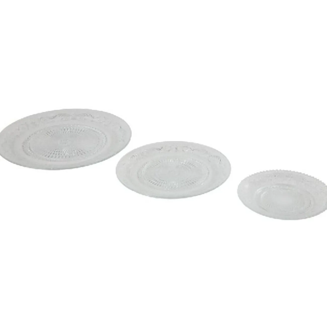 Service vaisselle comprenant 6 assiettes plates Ø 25 cm, 6 assiettes à dessert Ø 20 cm et 6 coupelles Ø 11,5 cm, verre. Ne passe pas au lave vaisselle, ni au micro-ondes.