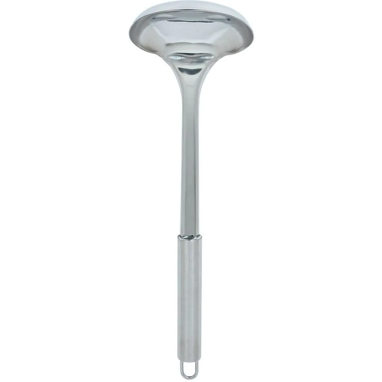 Cet ensemble pratique de 6 ustensiles de cuisine en acier inoxydable gris comprend : une spatule, une cuillère, une louche, une cuillère à spaghetti, une écumoire et un fouet.