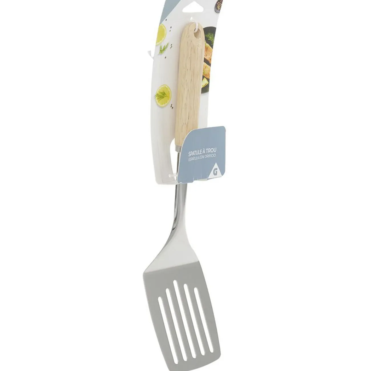 Spatule ajourée en inox avec manche en bois antidérapant pour une meilleure prise en main.