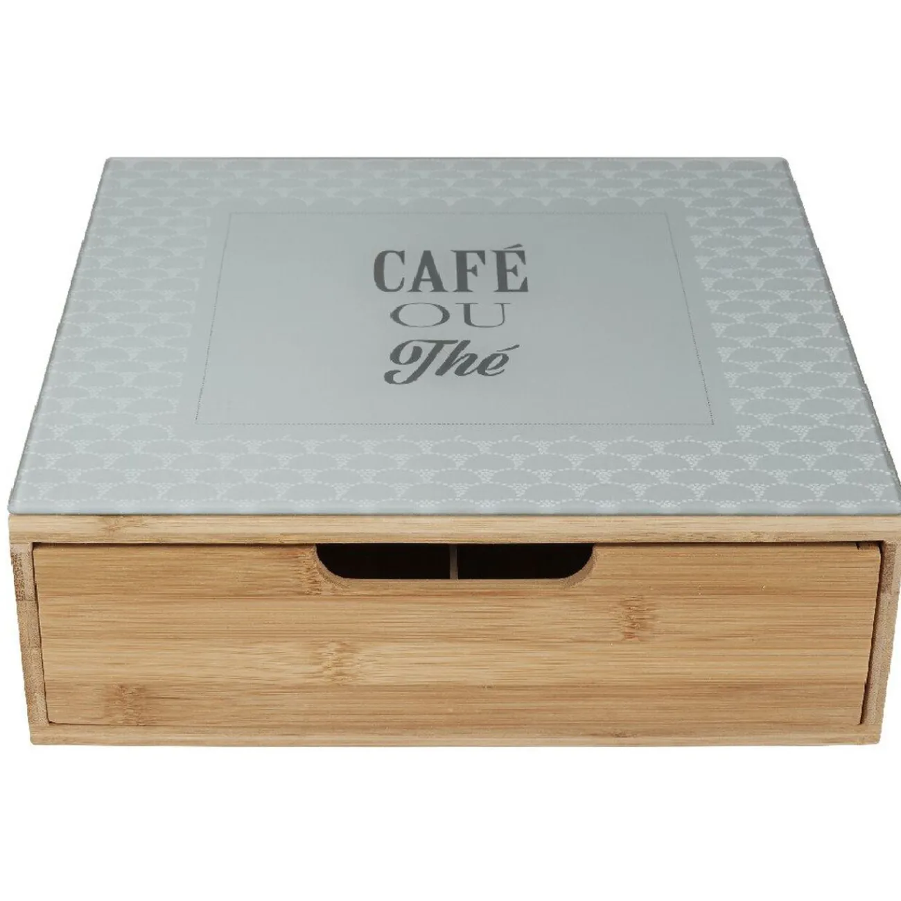 Tiroir toutes dosettes en bambou naturel et plateau en verre blanc design « CAFÉ OU THÉ ». Collection cocooning.