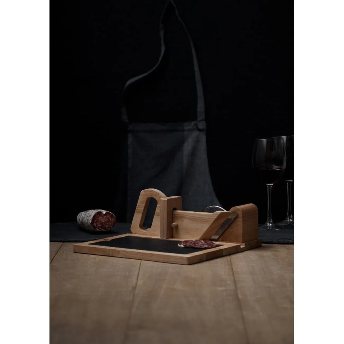 Trancheuse à saucisson en bois avec plateau en ardoise amovible.