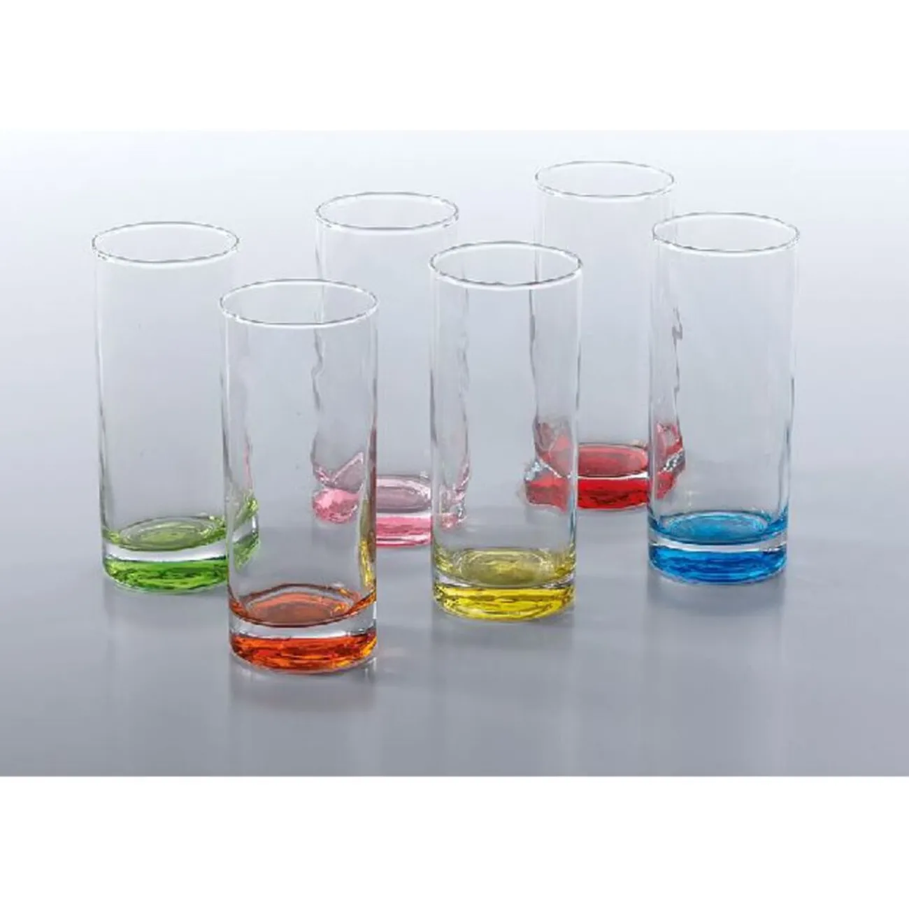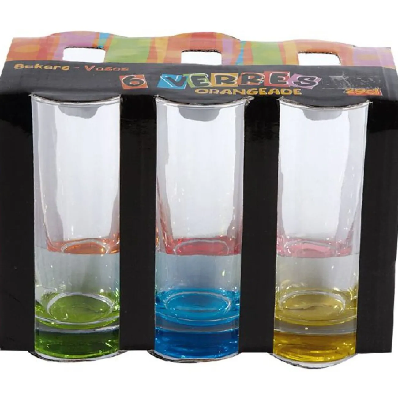 Lot de 6 verres à orangeade transparent avec fond coloré de couleur bleu, rouge, jaune, rose, orange et vert.