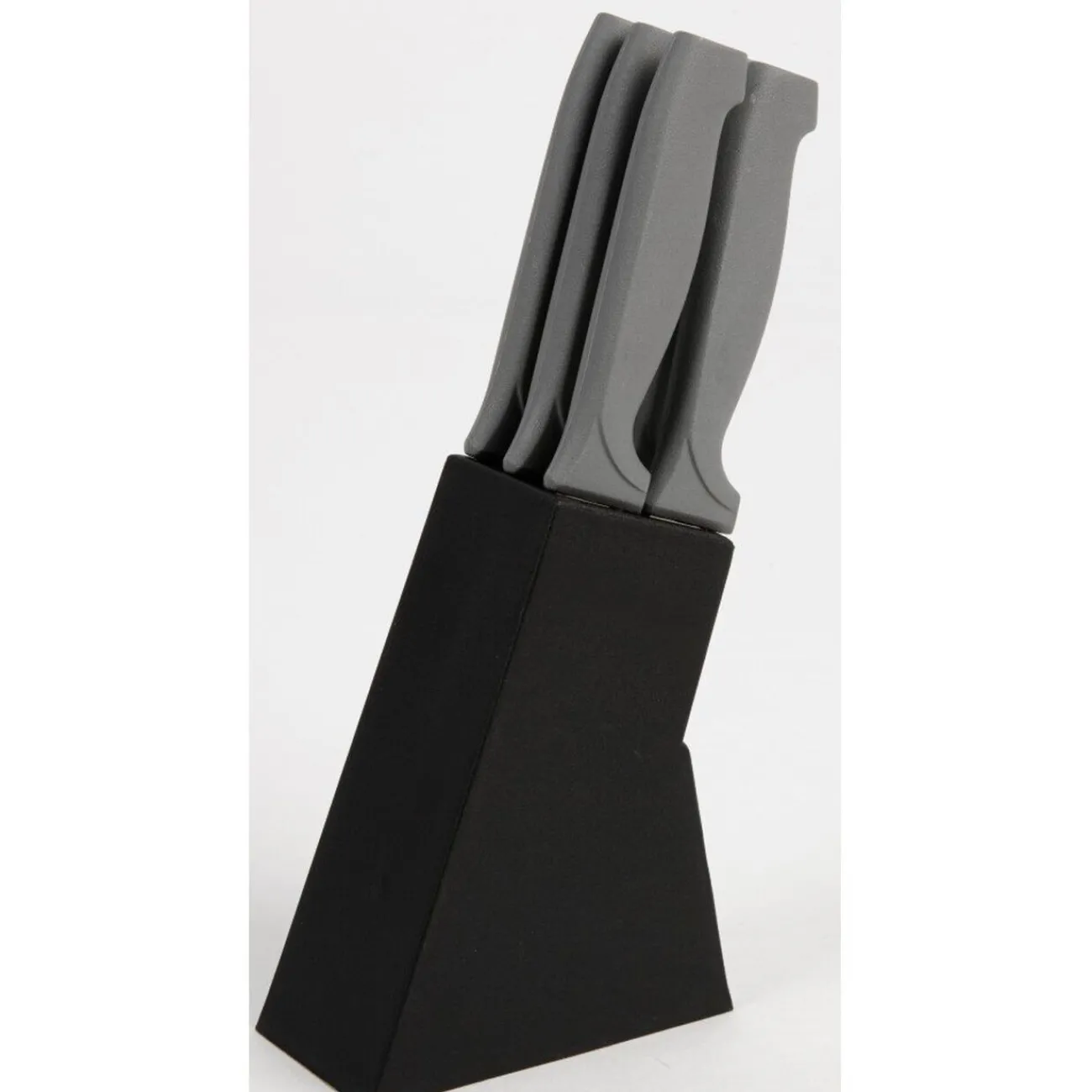 Couteaux à steak en inox x6 avec bloc de rangement. Ce produit existe en 4 coloris différents, modèle aléatoire selon disponibilité en magasin – Couleurs : noir, rouge, gris, taupe – Dimensions : L.5 x P.9,5 x H.22 cm – Matières : Inox, polypropylene