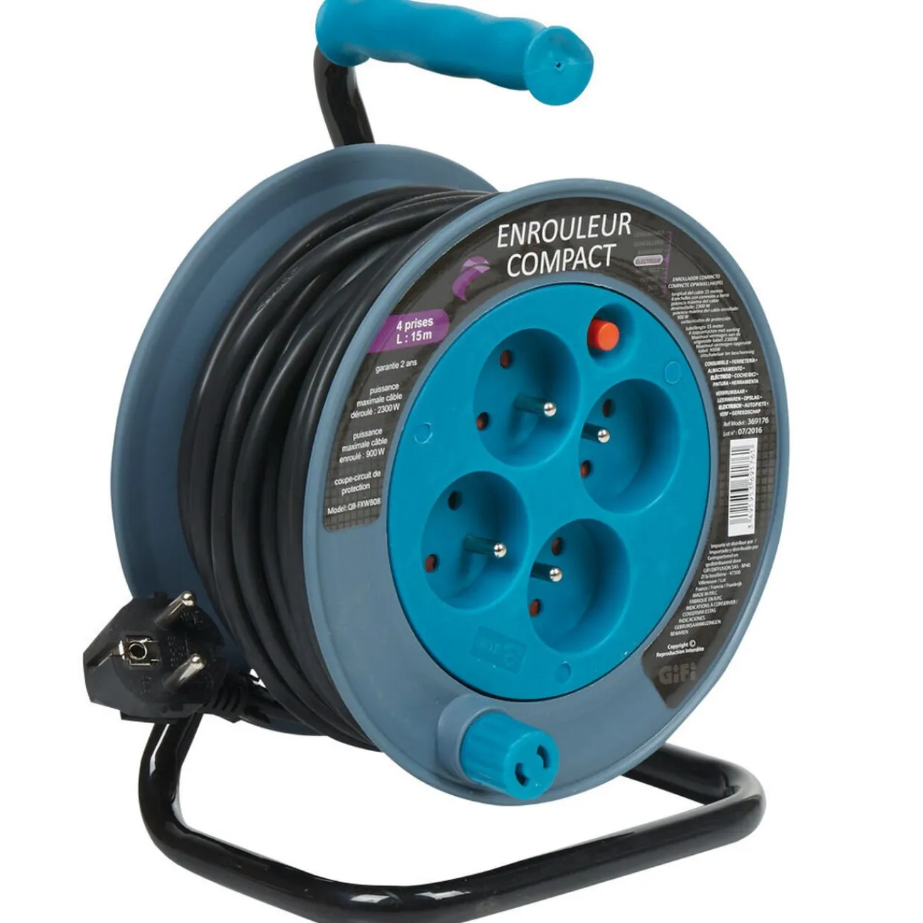 Enrouleur 4 prises bleu et gris, L.15 m, di.24,5x18x16 cm, polypropylène..