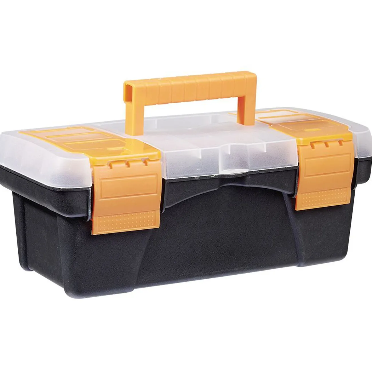 Boîte à outils en plastique robuste avec petits compartiments sur le couvercle pour transporter et garder vos outils bien ordonnés.