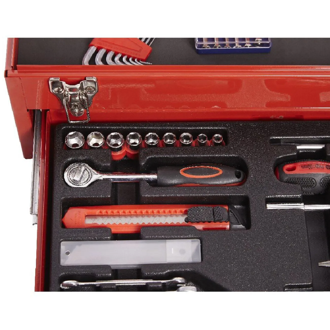 Comprend 83 pièces : tournevis porte-embouts, tournevis, embouts 25 mm, pince à long bec, porte-embouts, clé doubles, cutter, lames, manche à cliquet, douilles, clés hexagonales, pince serre-tube 25 cm …