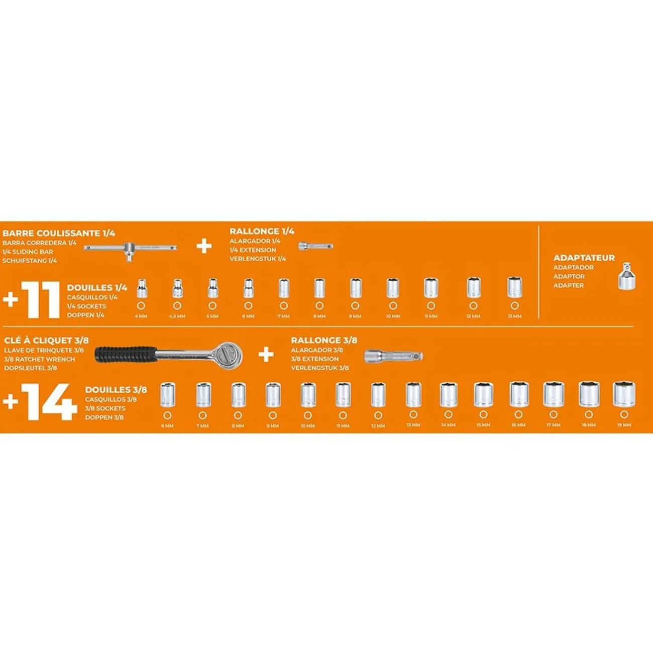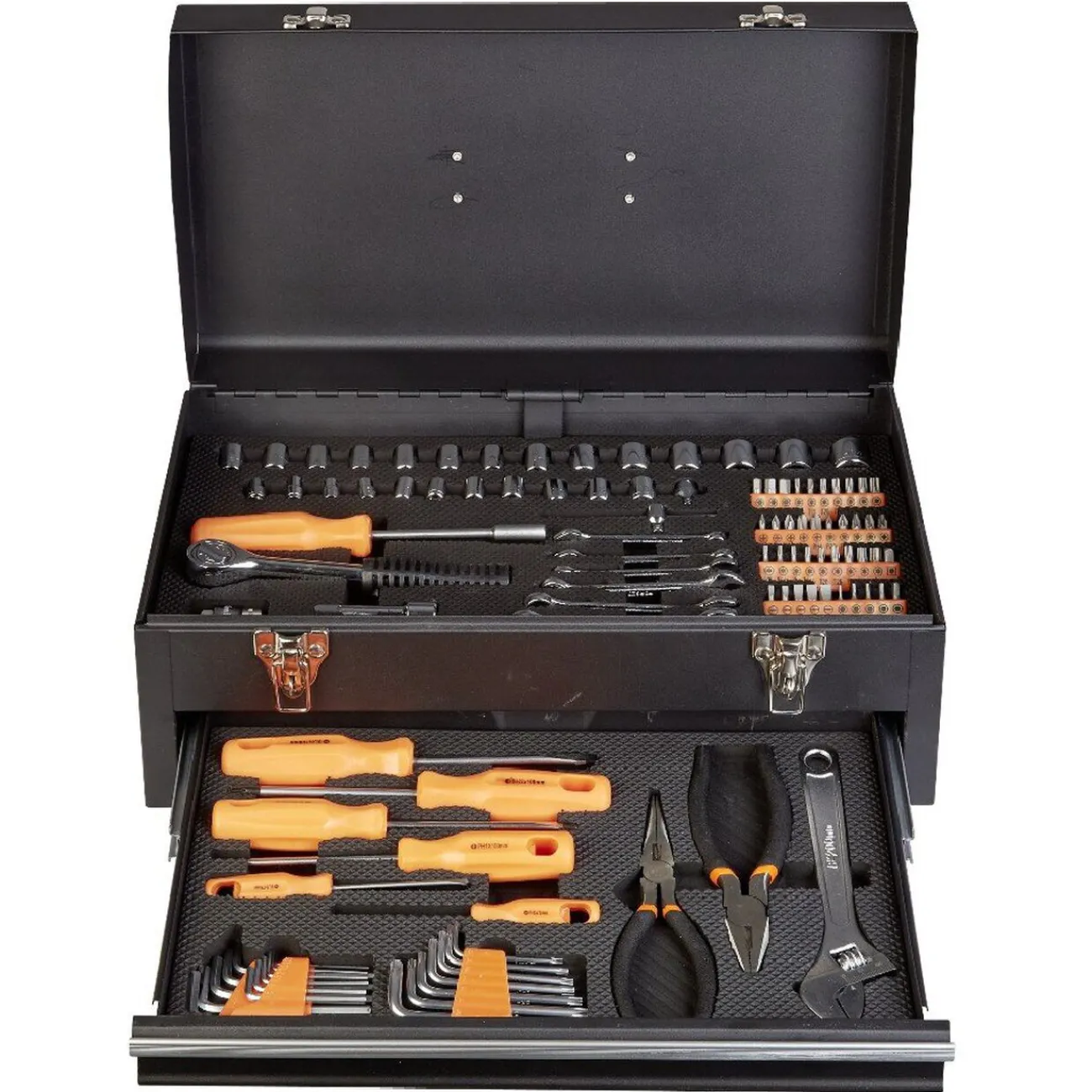 Elle comprend 119 pièces dont des tournevis, des embouts, des douilles, une clé à cliquet, une clé à molette, des clés mixtes, des clés Allen, une pince à bec long, une pince universelle …