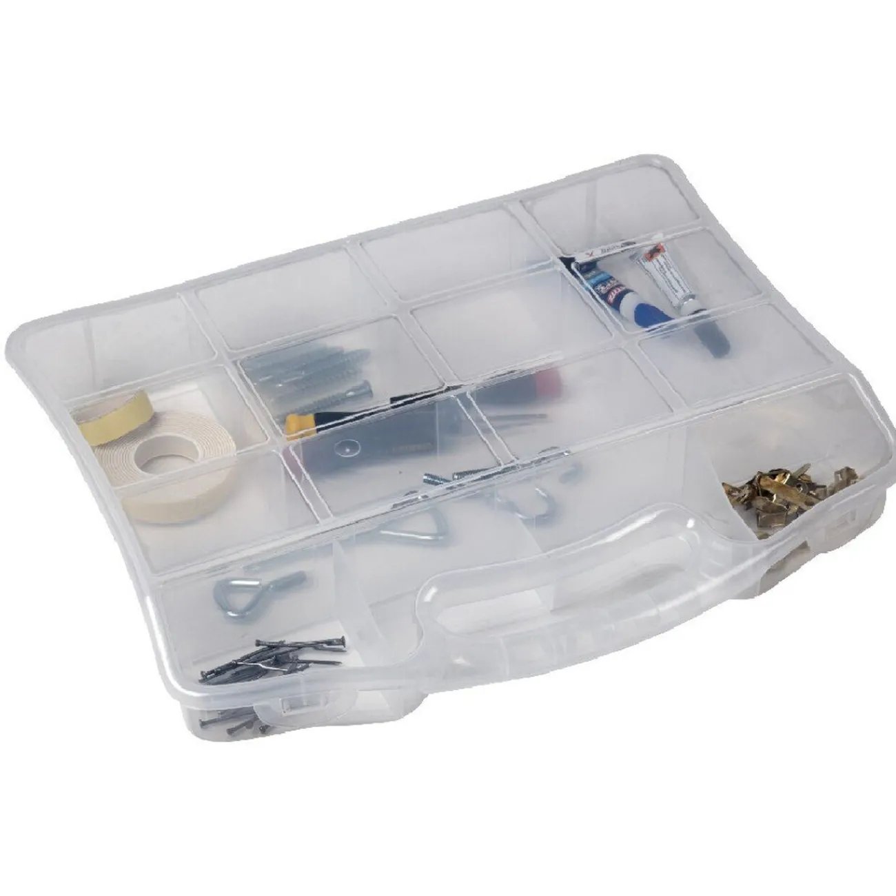 Mallette compartimentée transparente pour bricolage, dim. 35×25,5×5,5 cm, plastique.