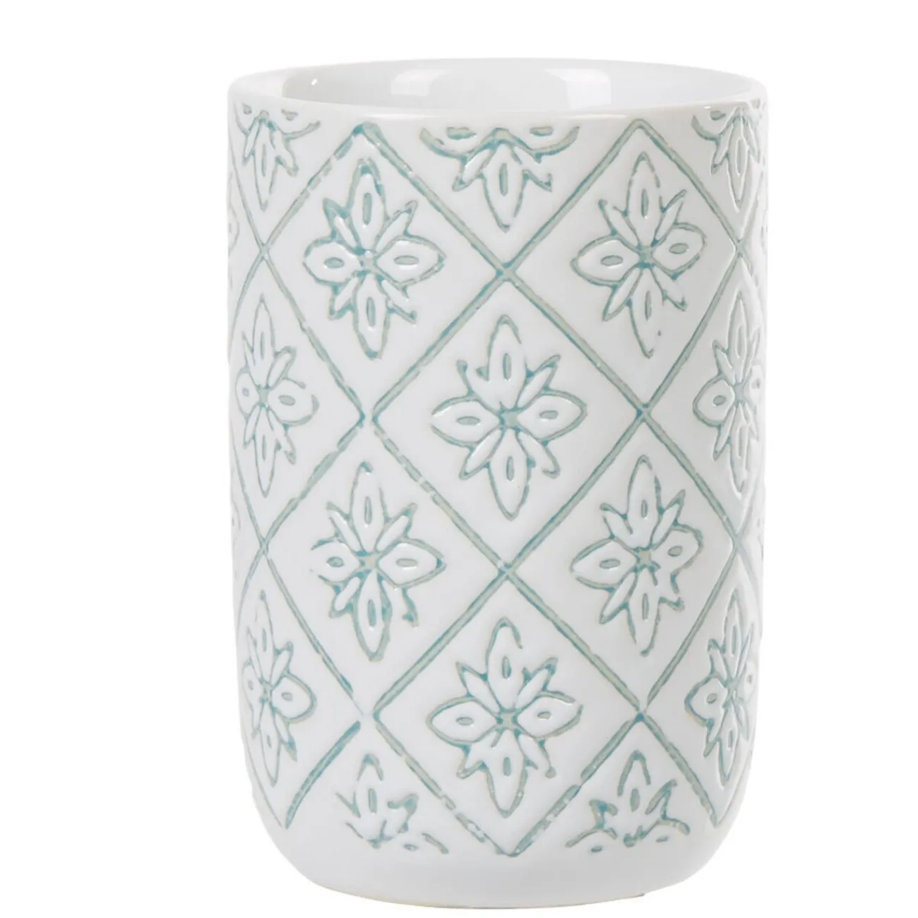 Optez pour ce gobelet en céramique blanche avec motif en relief rosace et losange bleu.