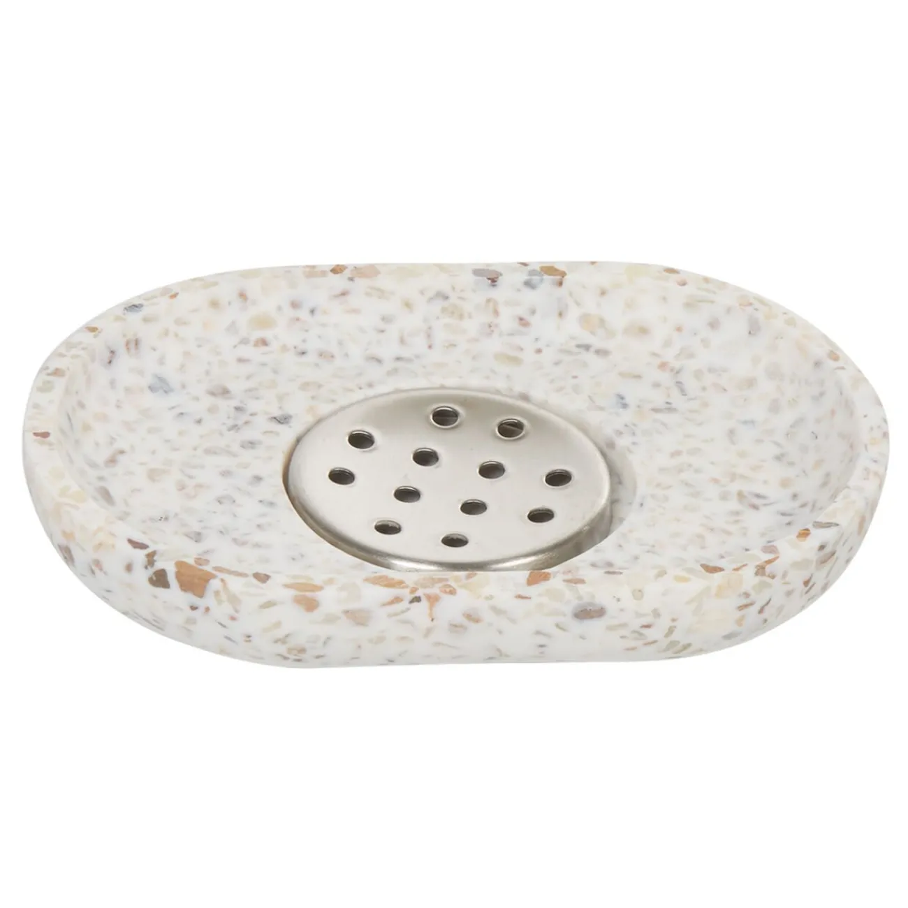 Esthétique et tendance, posez ce porte-savon Terrazzo en résine effet granit beige naturel sur votre lavabo ou près de votre baignoire.