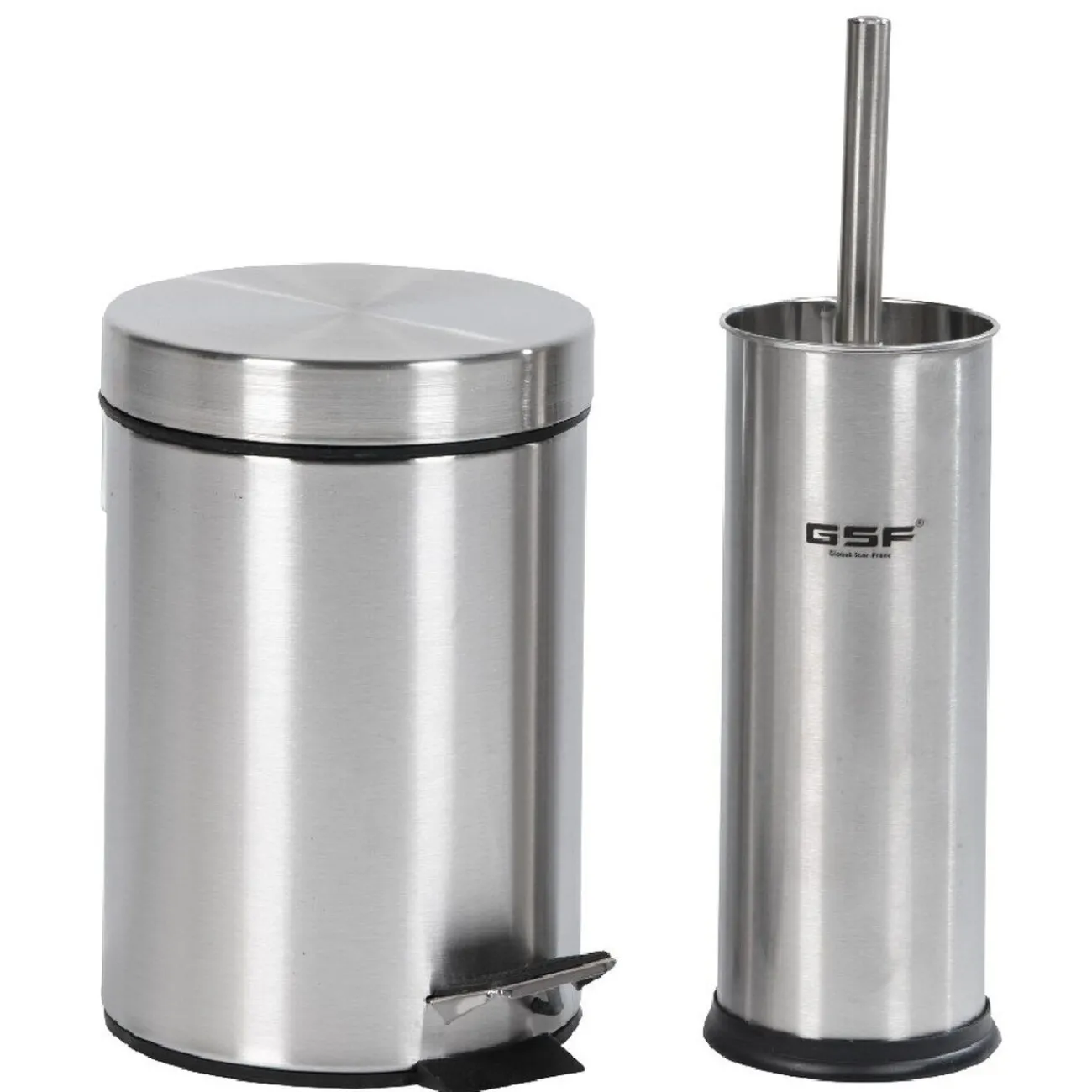 Poubelle salle de bain à pédale 3 L, dim. Ø17xh.25 cm, et brosse WC (pot dim. Ø9,5xh.25 cm), inox.