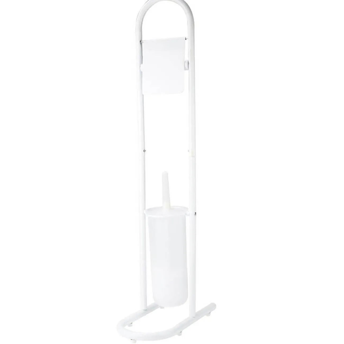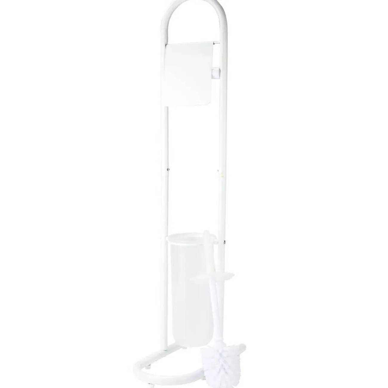 Serviteur WC blanc avec une brosse et un support pour papier toilettes. L’indispensable aux latrines !