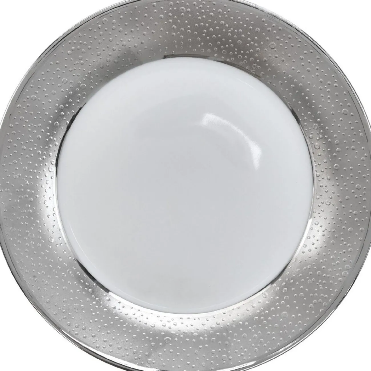 Assiette à dessert en porcelaine blanche au contour à l’effet texturé argenté.