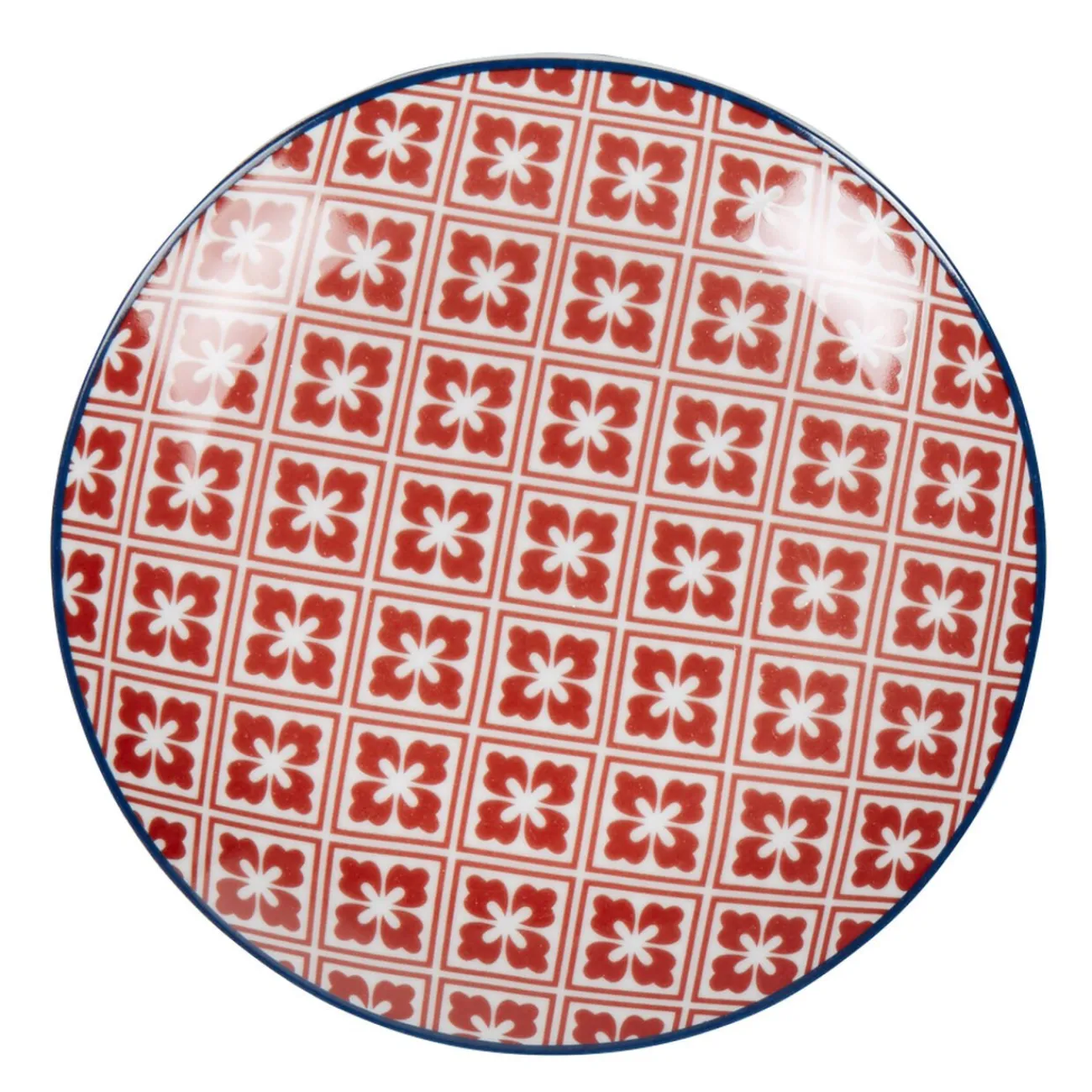 Assiette à dessert à motifs carreaux de ciment rouge.