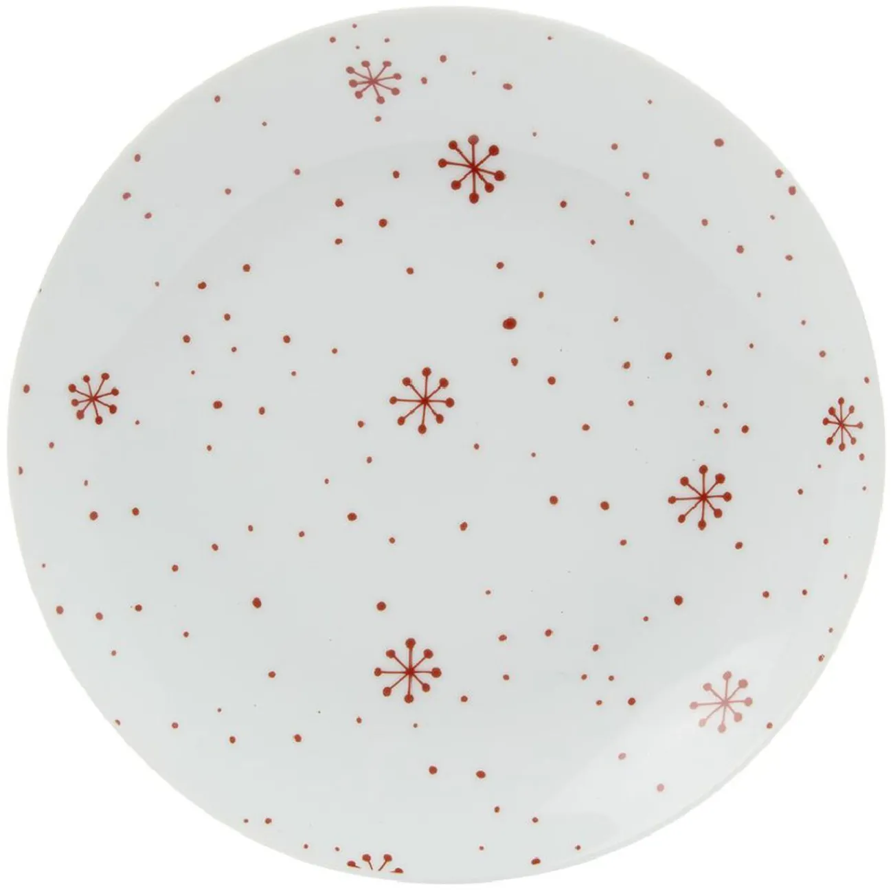 Cette assiette à dessert ronde à motif flocons rouge apportera tout son charme à votre table de fête pour Noël.
