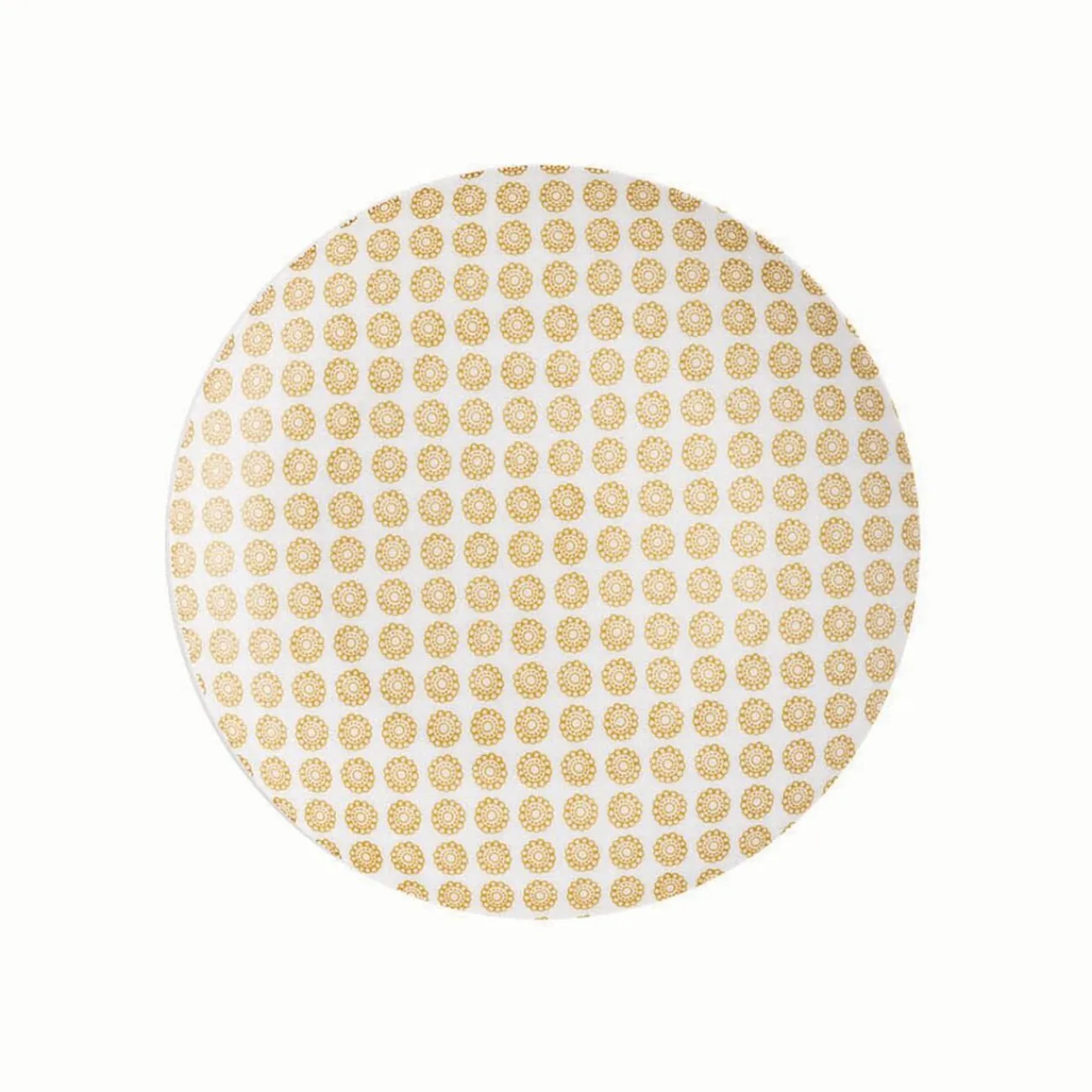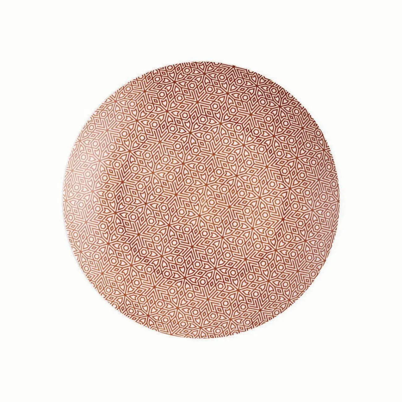 Lot de 4 assiettes à dessert rondes en porcelaine avec motifs géométriques similaires et couleurs pastels différentes pour chacune des assiettes : une rouge, une verte, une bleue, une jaune.