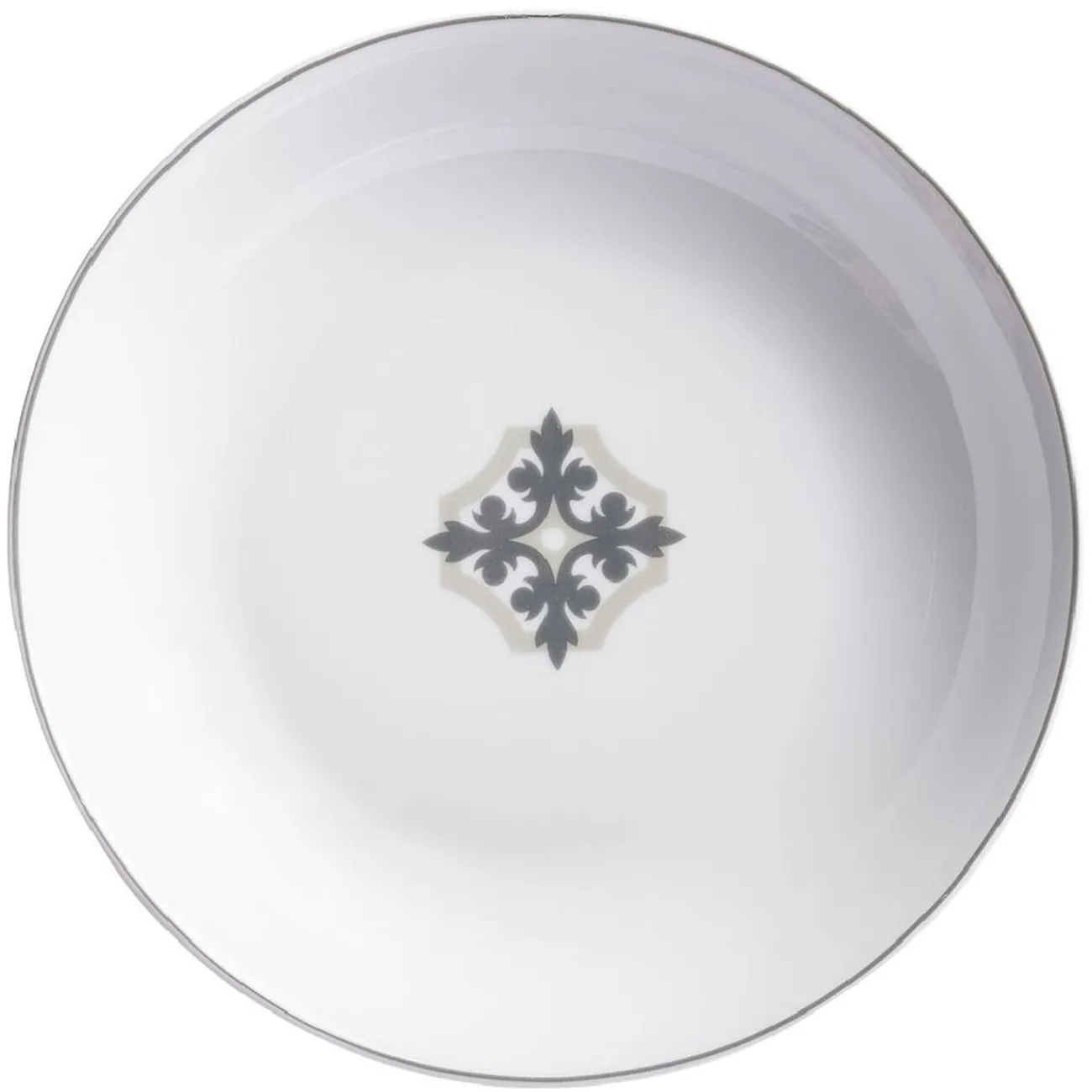 Assiette creuse blanche à motif flocon dans le style carreau de ciment. Idéale pour donner un style authentique et chaleureux à votre table.