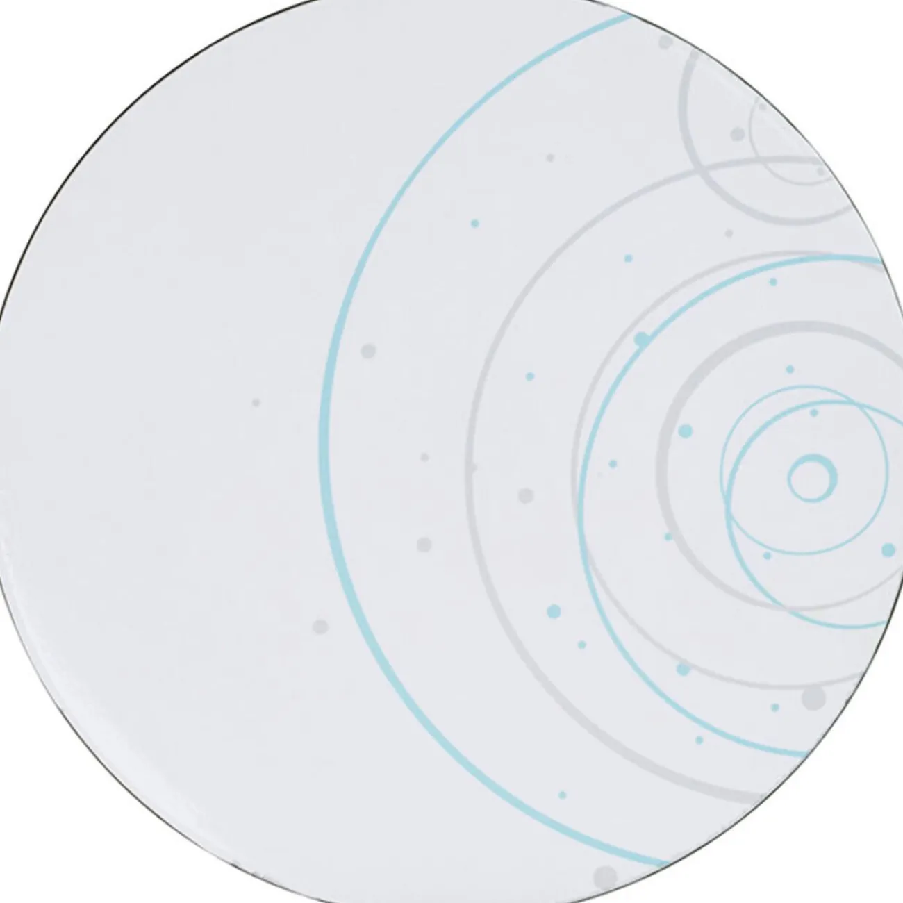 Assiette de présentation blanche design cercles et ronds gris et bleus, Ø 33 cm, plastique.