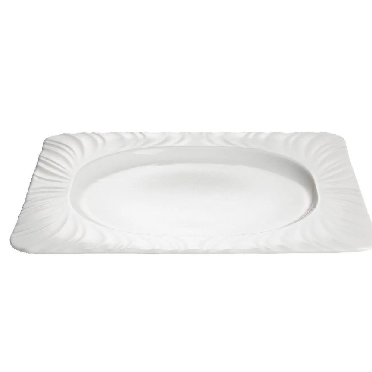 Assiette plate Feston carrée avec rond à l’intérieur et bords arrondis de couleur blanche.