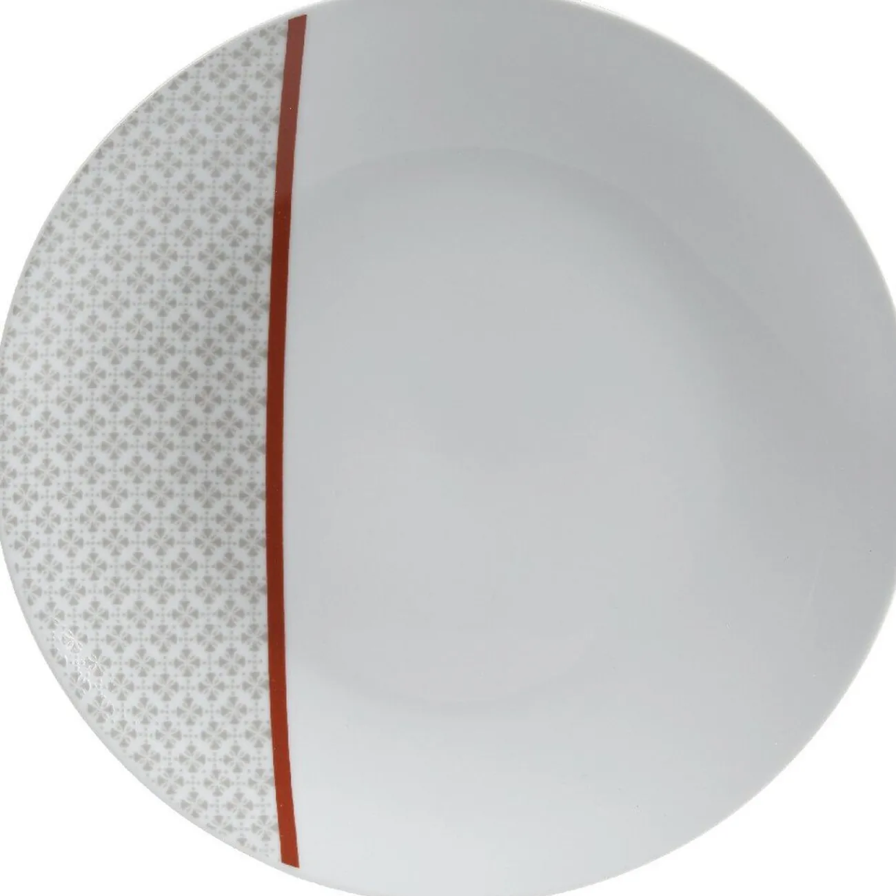 4 assiettes plates rondes de la gamme Oreige imprimées de petites fleurs en forme de trèfles gris d’un côté et uni blanc d’un autre côté séparé d’une ligne rouge.