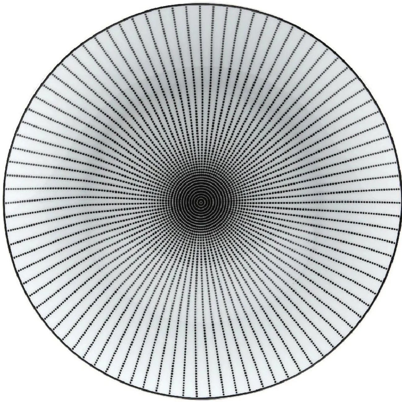 Assiette plate blanche avec motifs striés et rond central noirs.