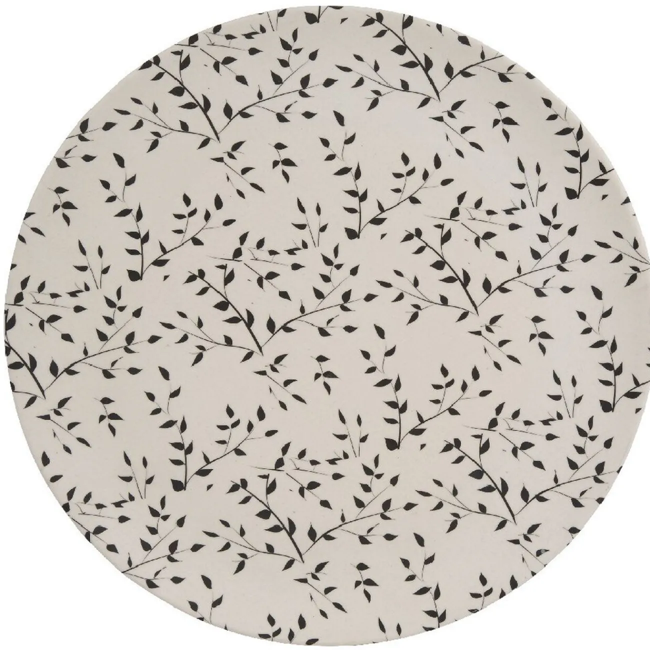 Assiette ronde en fibre de bambou de couleur blanche imprimée de tiges et feuilles noires.