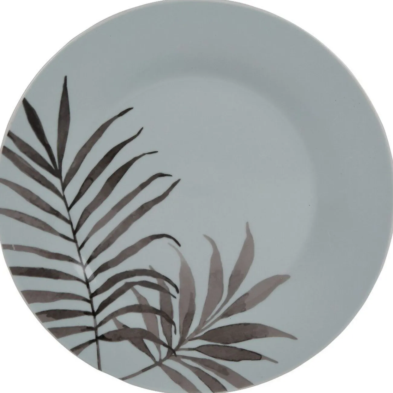 Assiette plate en porcelaine blanche à motif feuilles noires.