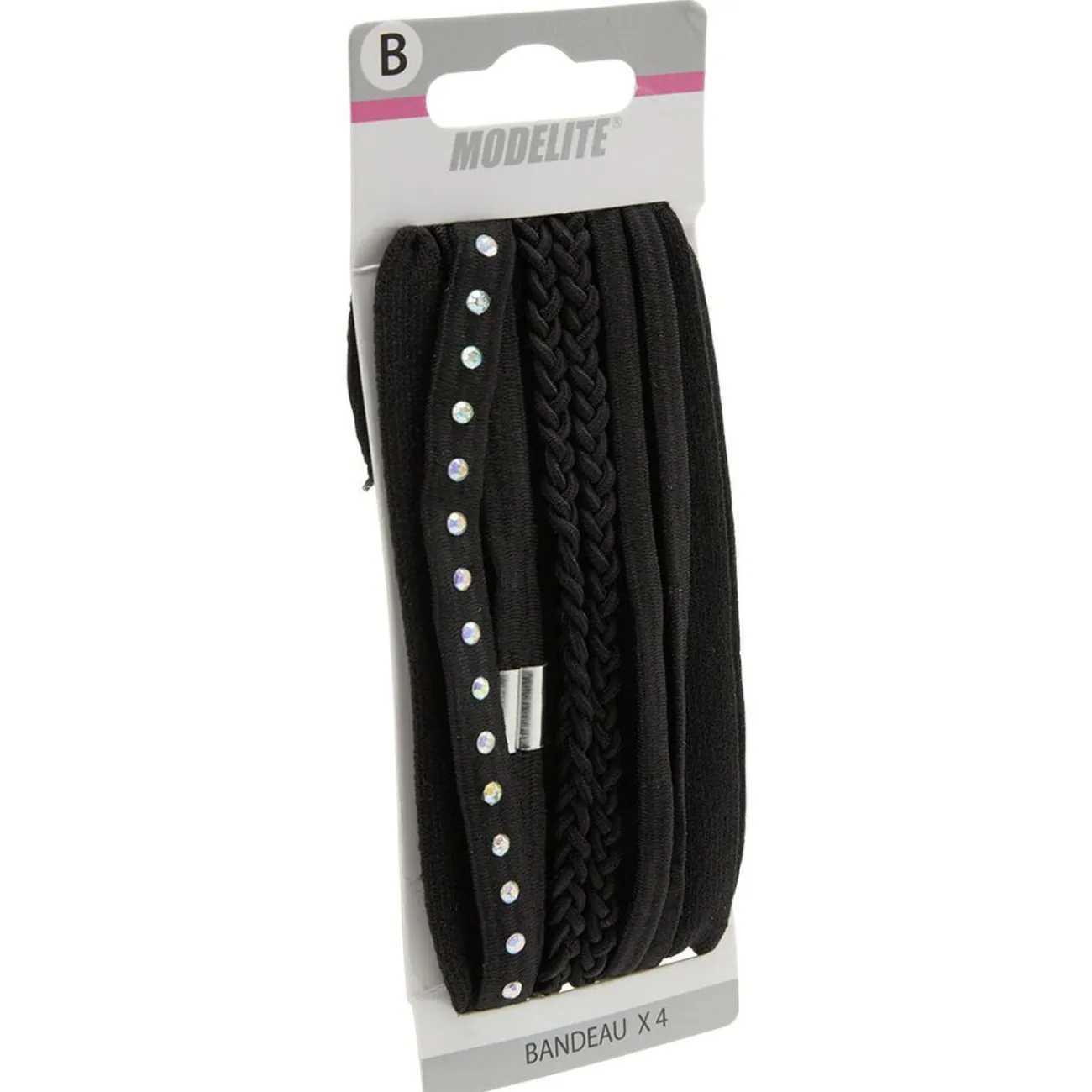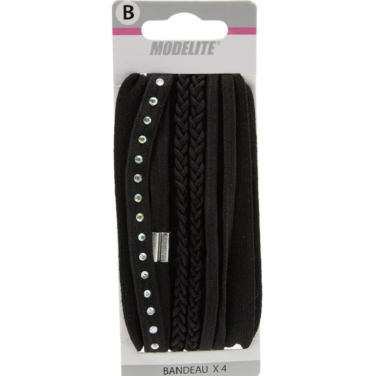 Lot de 4 bandeaux pour accessoiriser vos cheveux en différentes coiffures: 1 en maille large et les 3 autres élastiques, tressé, à strass et fin noir.