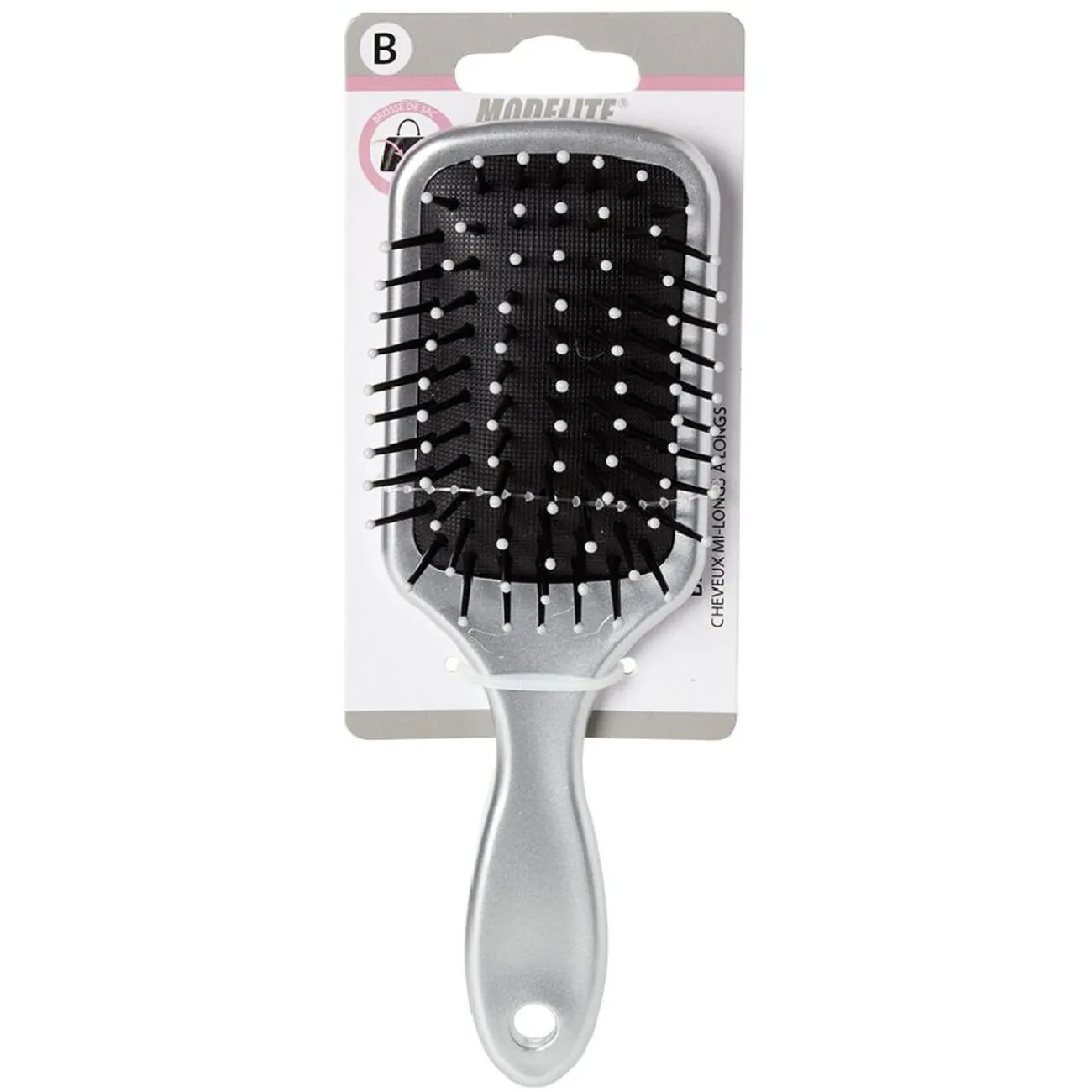 Brosse pneumatique rectangulaire avec picots en pvc perlés pour un démêlage et un coiffage des cheveux tout en douceur.