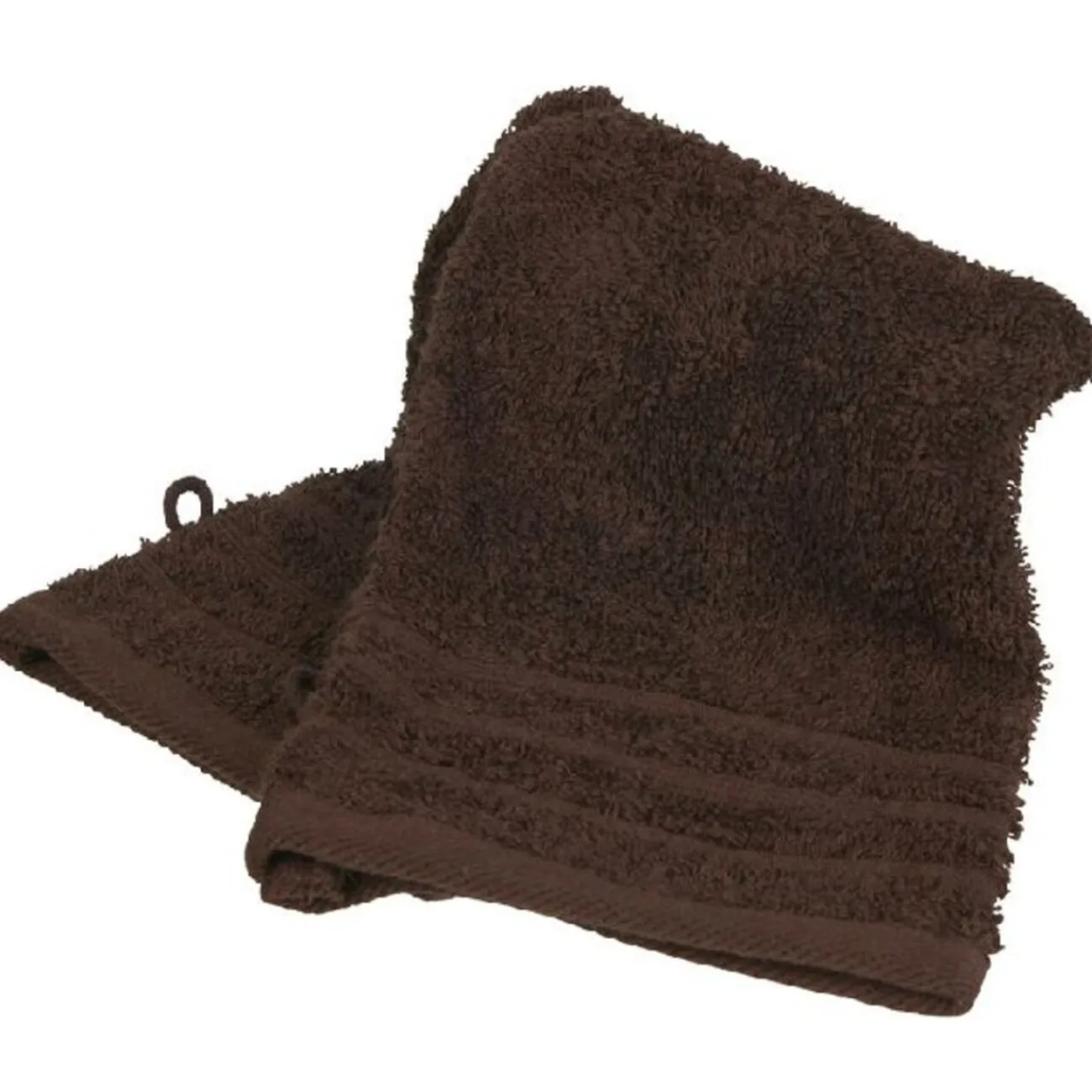 2 gants de toilette, dim. 15×21 cm, 100 % coton, 450 gr/m², couleur chocolat.
