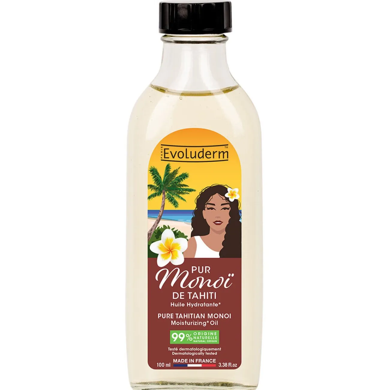 Hydratez votre corps avec l’huile Evoluderm pur monoï de Tahiti, composée à 99% d’ingrédients d’origine naturelle.