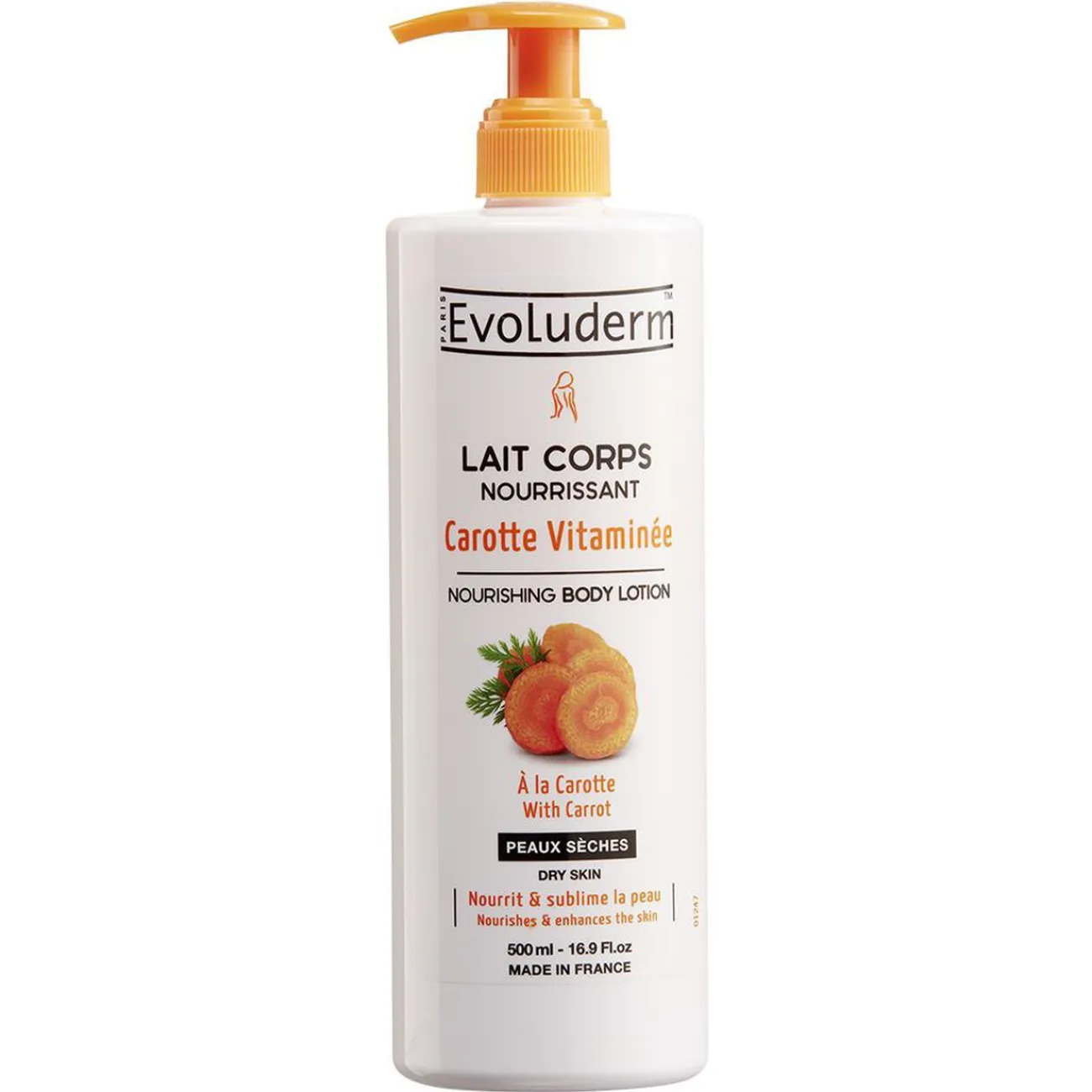 Lait nourrissant Evoluderm Carotte vitaminée pour le soin des peaux sèches et ternes.