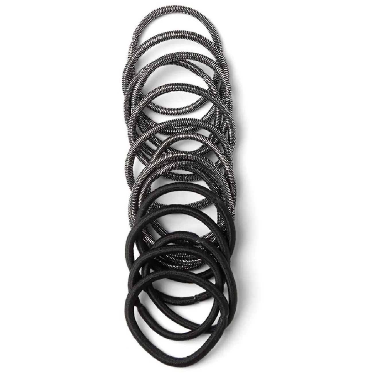 Lot de 15 élastiques à cheveux en polyester, comprenant 5 élastiques noirs classiques et 10 élastiques noir et blanc à l’aspect chiné.