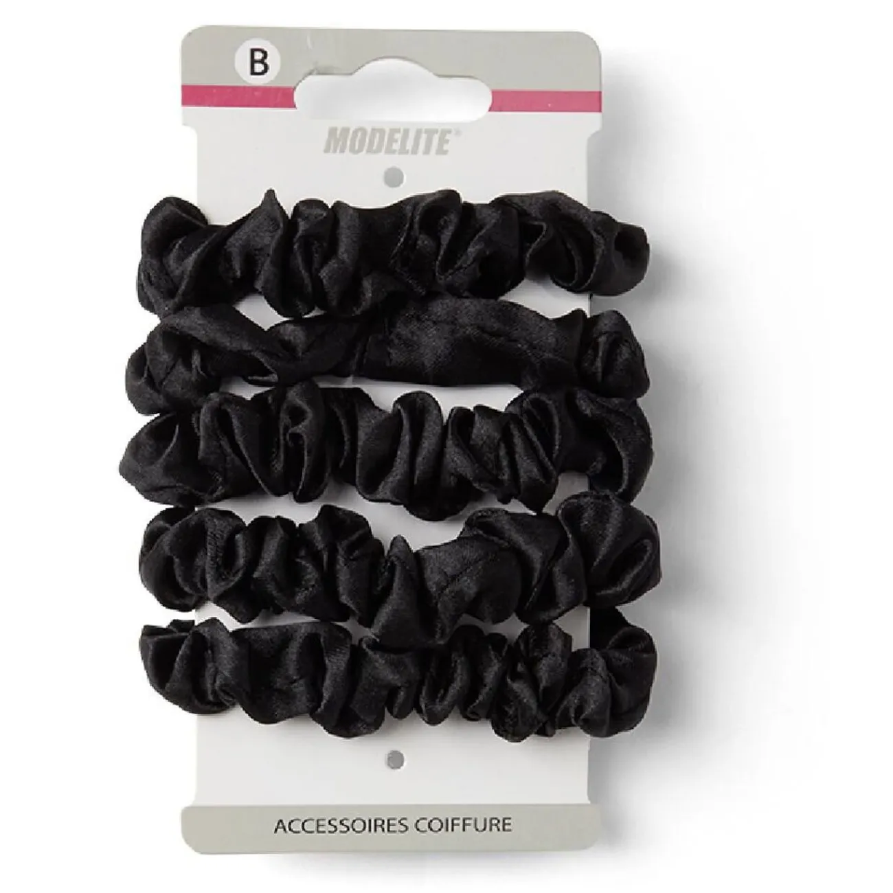 Lot de 5 chouchous scrunchies en polyester satiné noir, un accessoire polyvalent pour coiffer vos cheveux avec style.