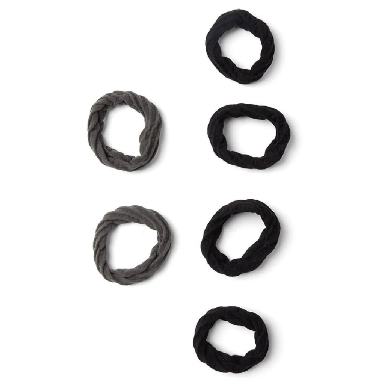 Lot de 6 élastiques à cheveux en polyester doux, comprenant 4 élastiques noirs et 2 gris.