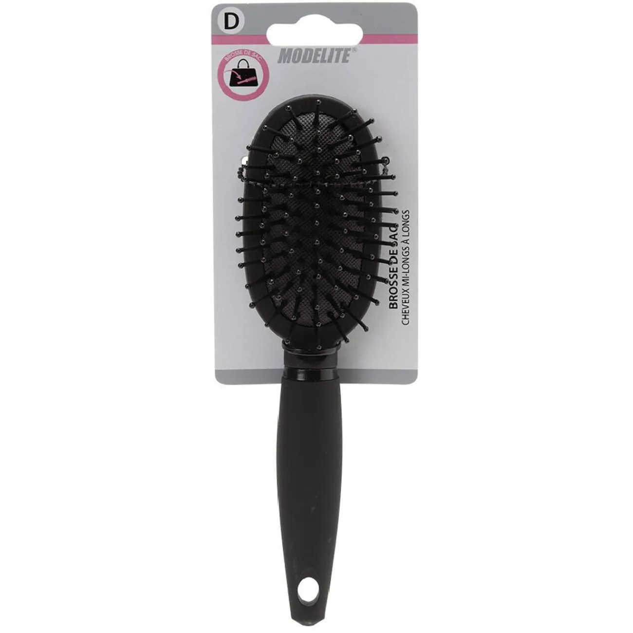 Brosse pneumatique en plastique noir avec picots perlés au format mini pour l’avoir toujours à portée de main dans son sac.