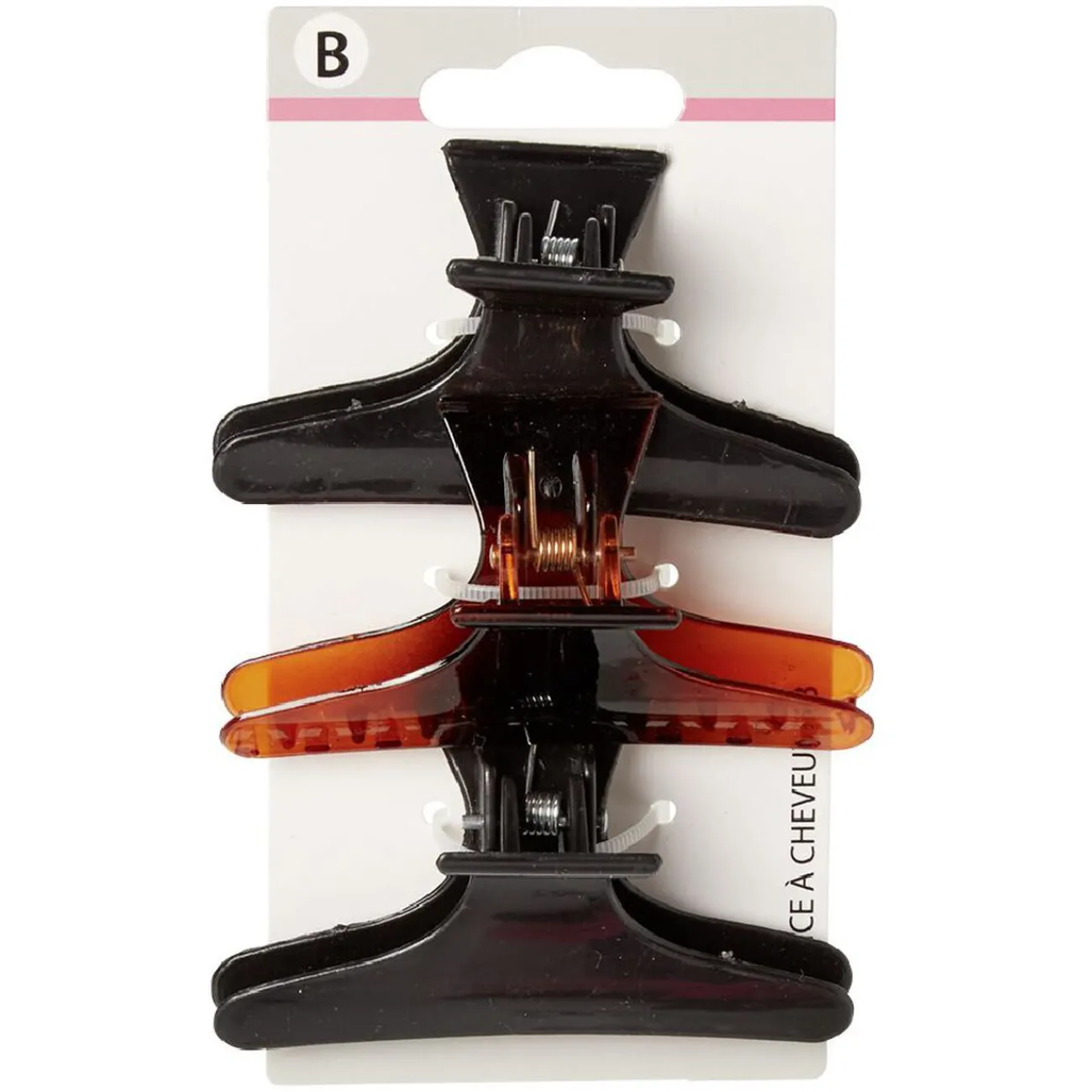 Lot de 3 pinces à cheveux en plastique, 2 unies noires et 1 marron à motif écailles. Longueur : 8 cm