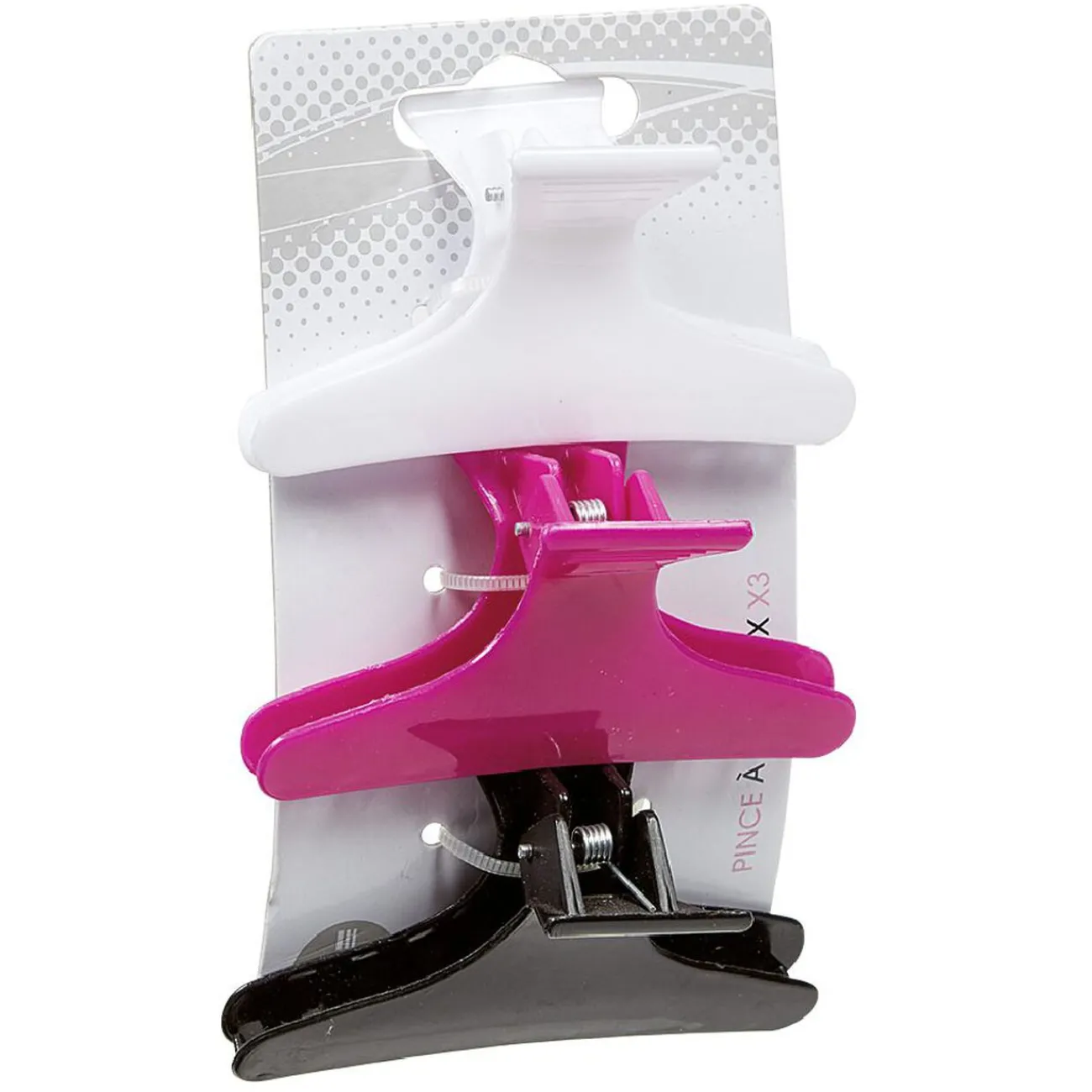 Lot de 3 pinces à cheveux en plastique uni blanc, rose et noir.
