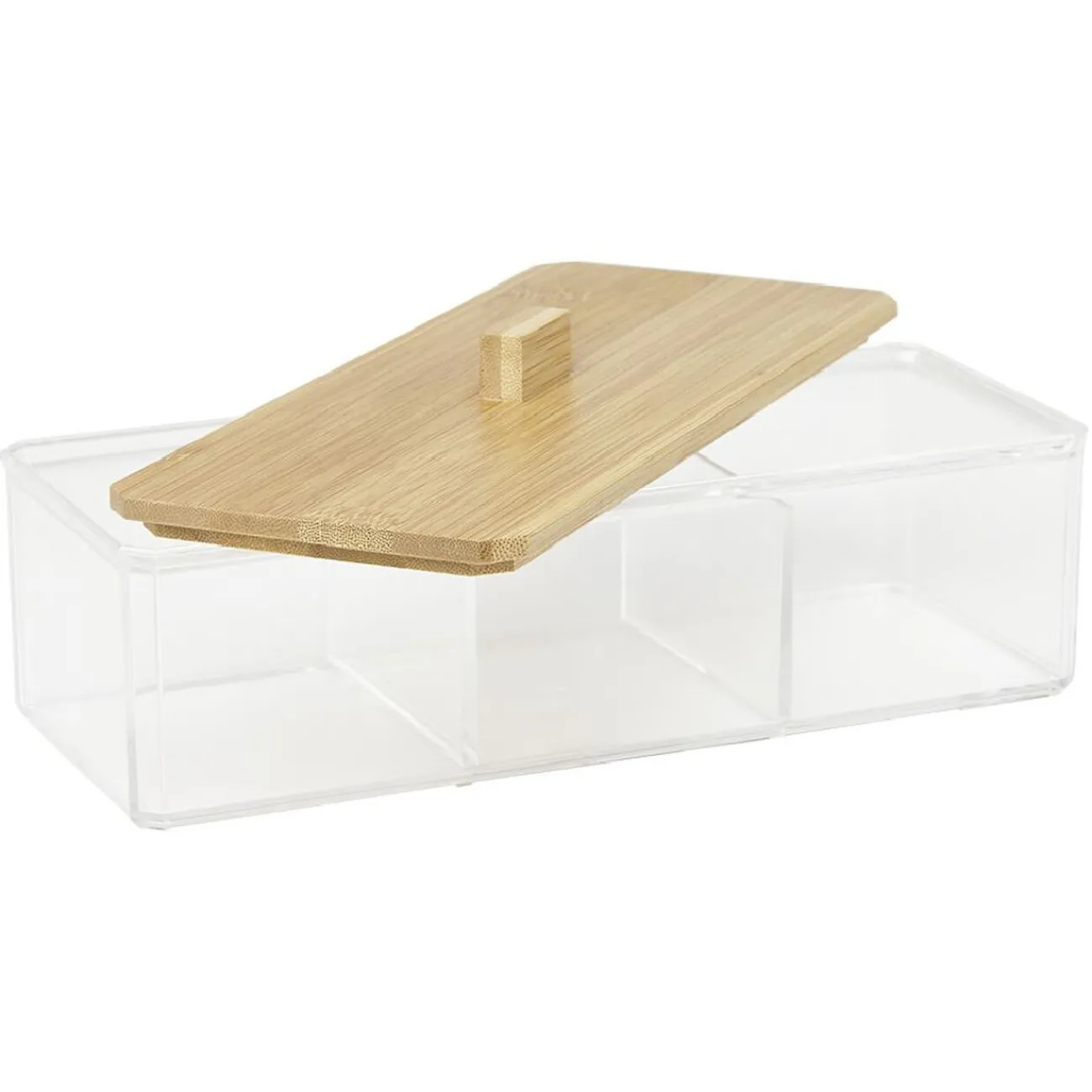 Rangement rectangulaire transparent avec un couvercle en bambou pour y mettre vos cotons tiges.