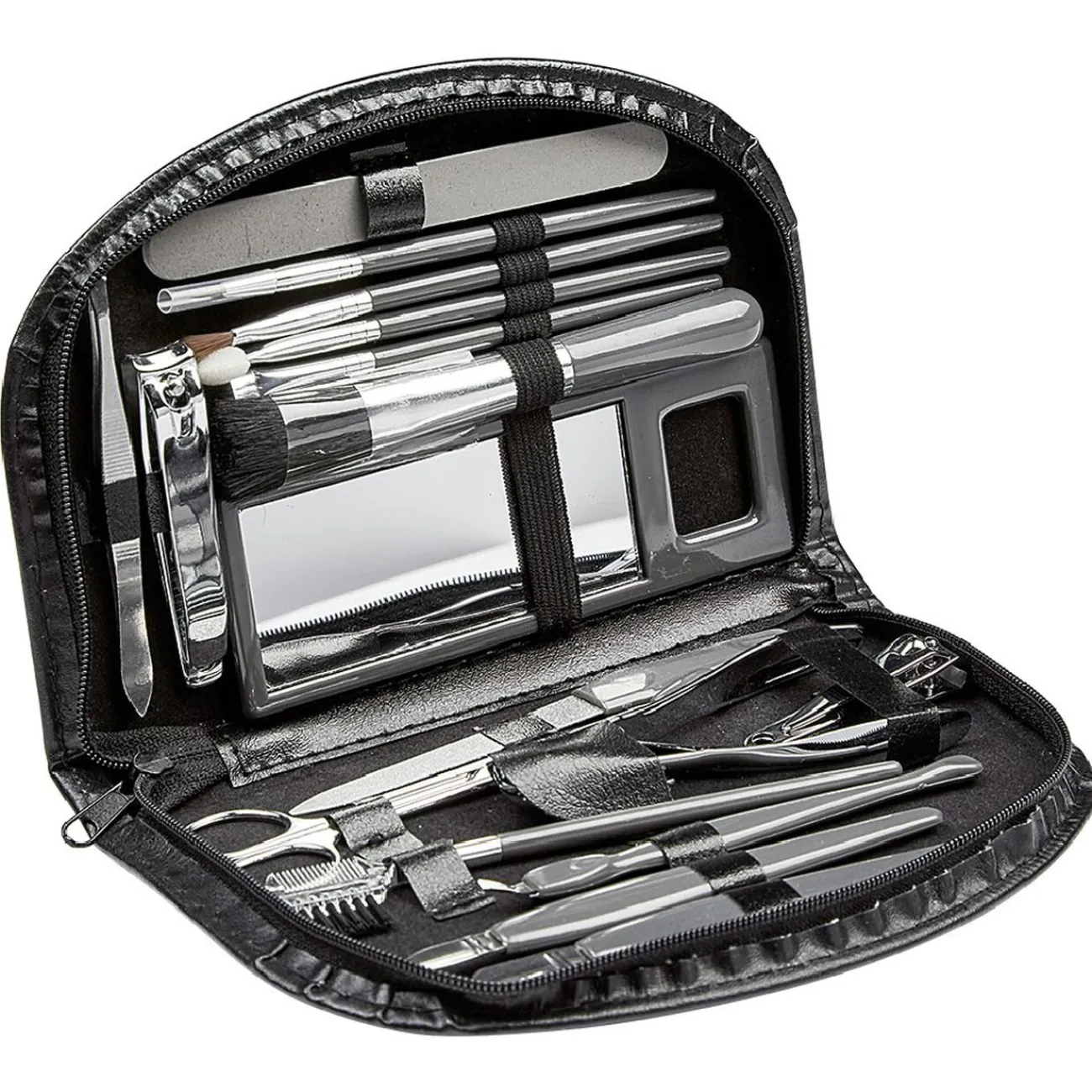 Ce set est composé de 18 pièces avec trousse de rangement incluse – Couleur noire – Dimensions : L17,7 x P11,8 x H2,7 cm – Matières : plastique et métal