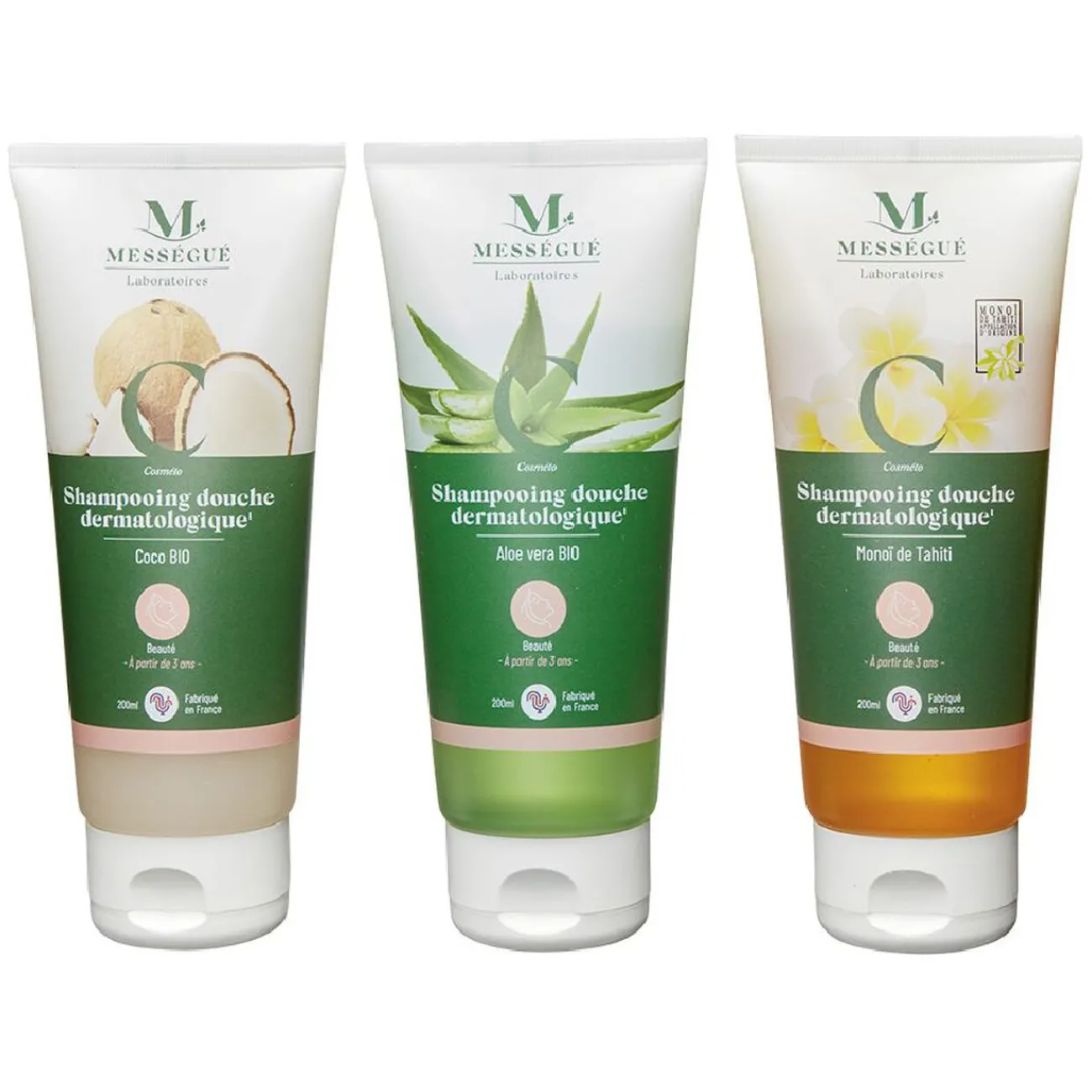 Coffret de 3 shampoings-douche Instant évasion de Mességué en flacon pompe de 200 ml.