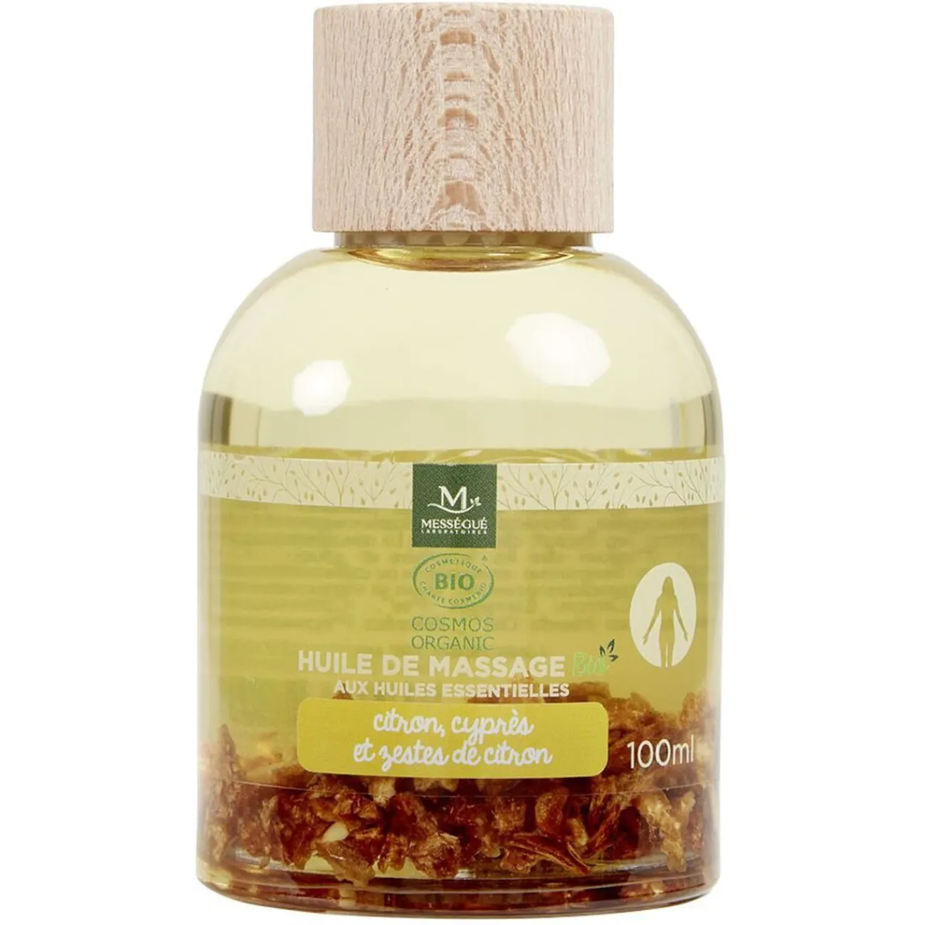 Flacon d’huile de massage BIO de Citron et Cyprès.