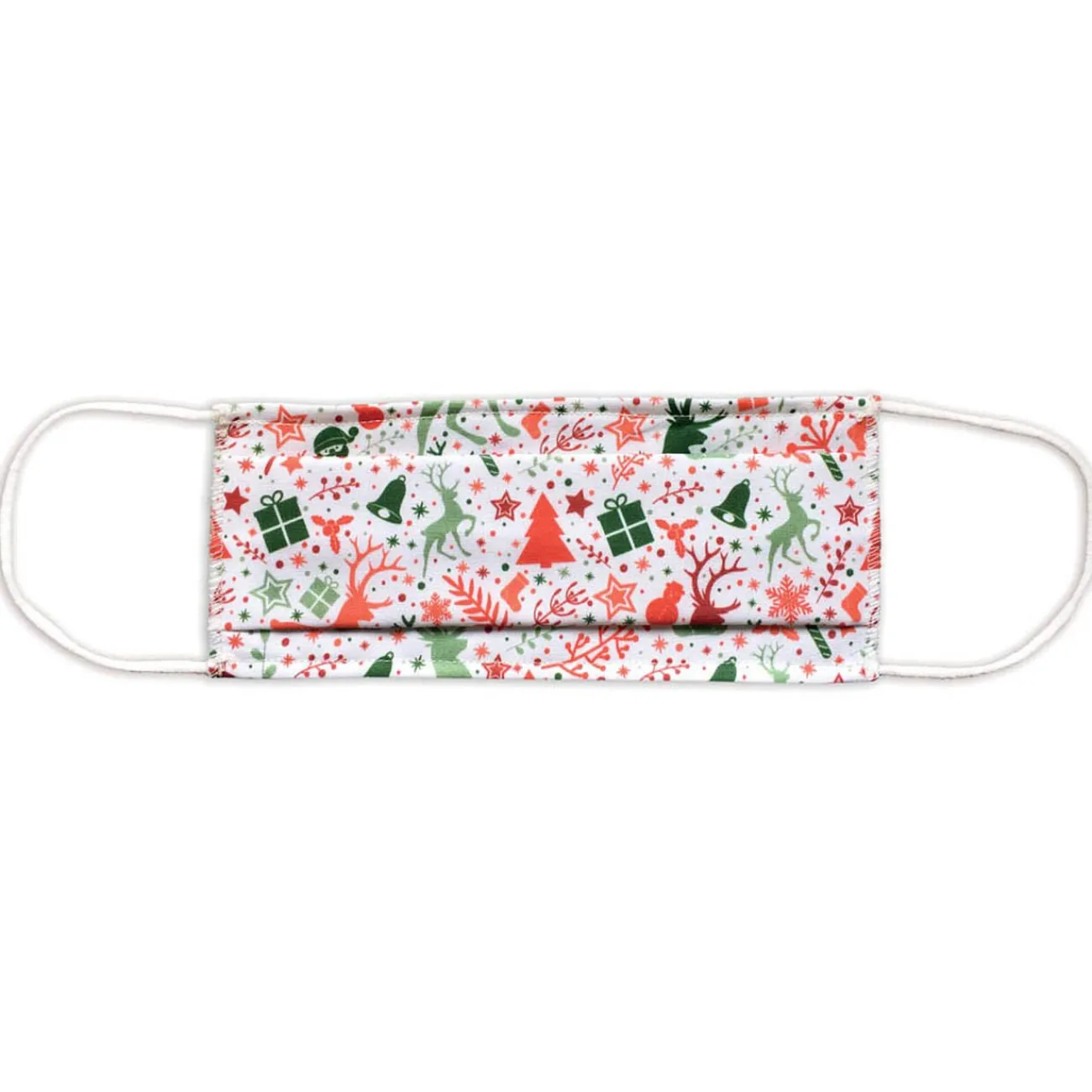 Masque catégorie 1 pour adulte en tissu blanc avec motifs rouges et verts de cerfs, cadeaux, sapins, etc.