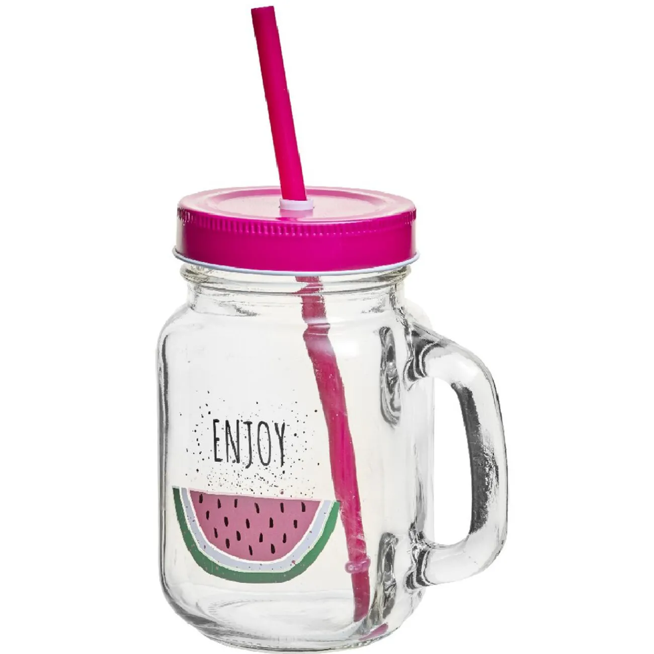 Matière : bocal en verre, couvercle en métal, paille en plastique.