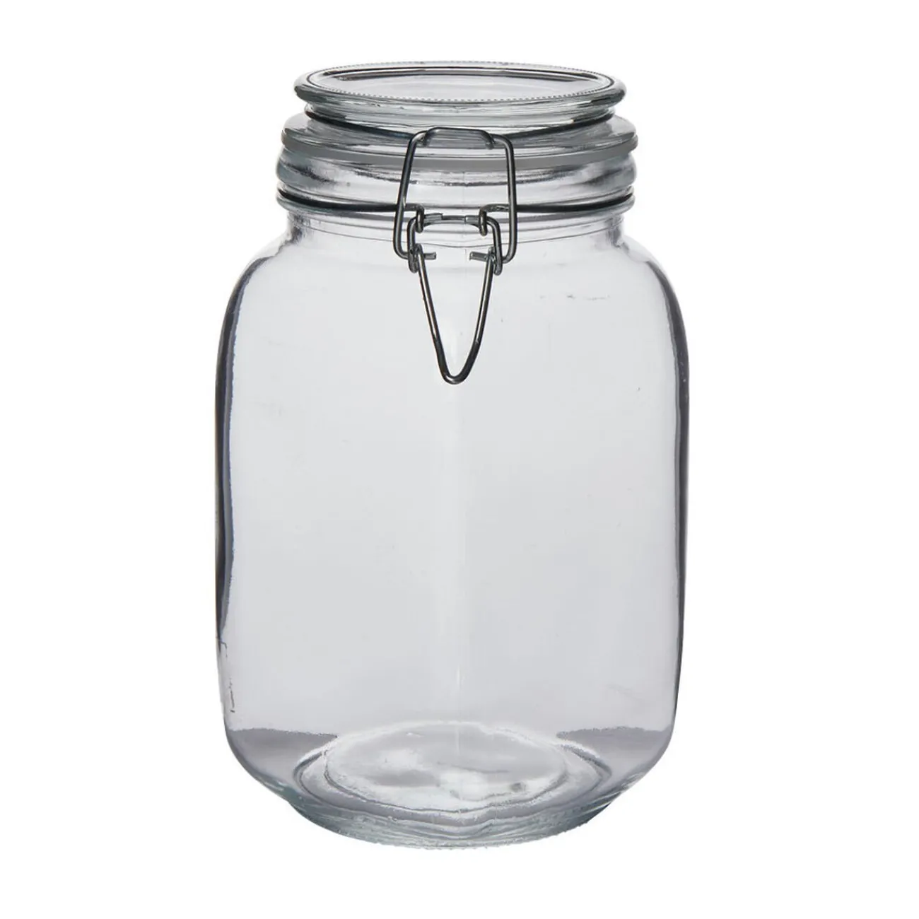 Bocal alimentaire transparent avec couvercle à fermeture métallique.