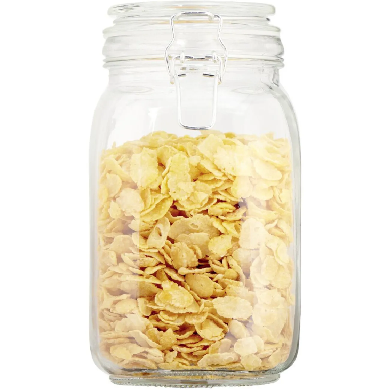 Bocal alimentaire transparent avec couvercle à fermeture métallique.