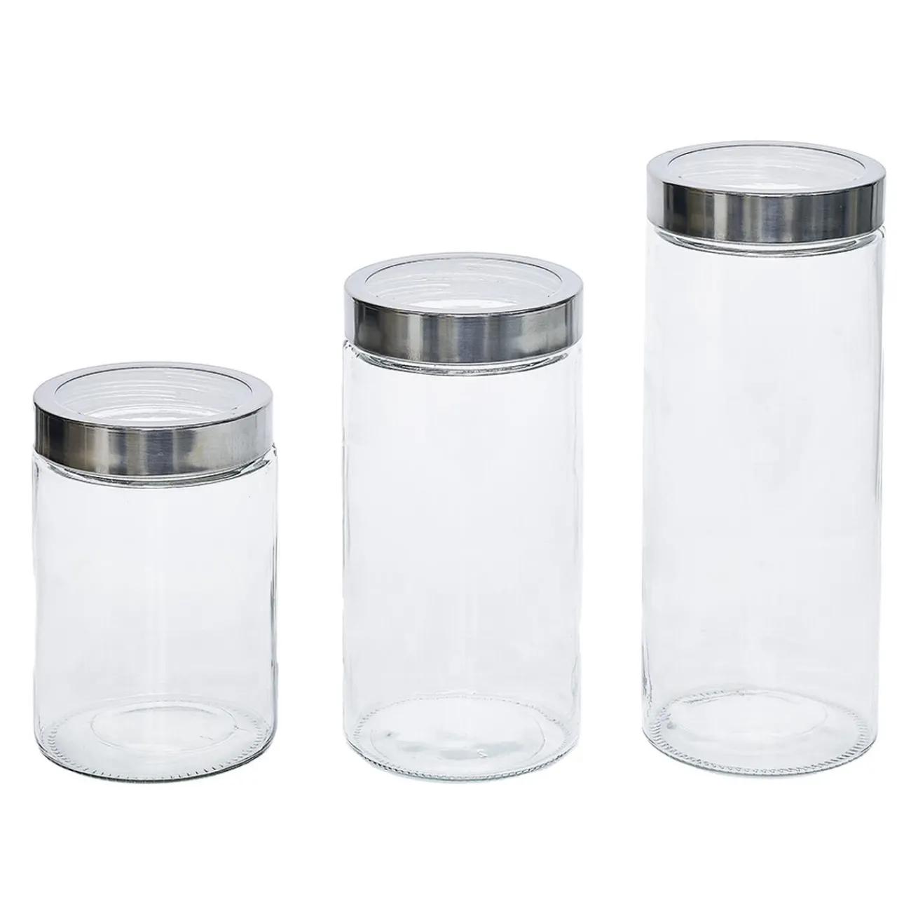 Lot de 3 bocaux en verre avec couvercle hermétique en métal et plastique de 3 taillles différentes. Idéal pour conserver les aliments en vrac tels que céréales, pâtes, riz, café…