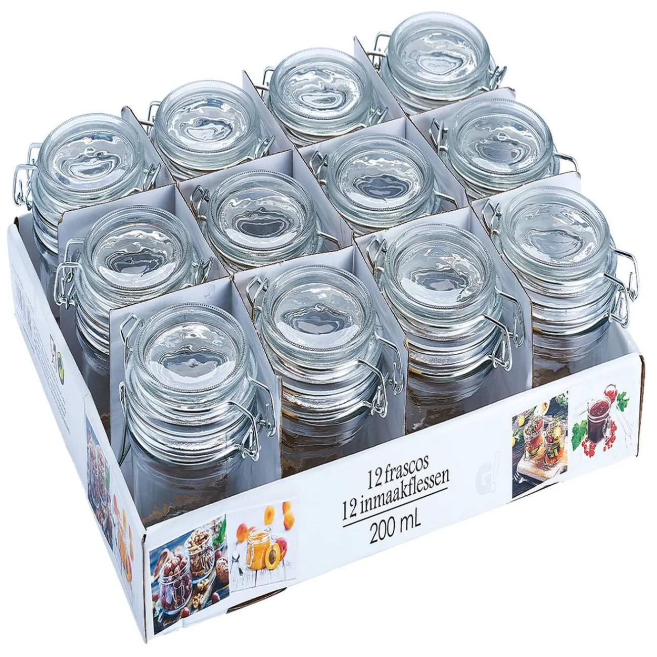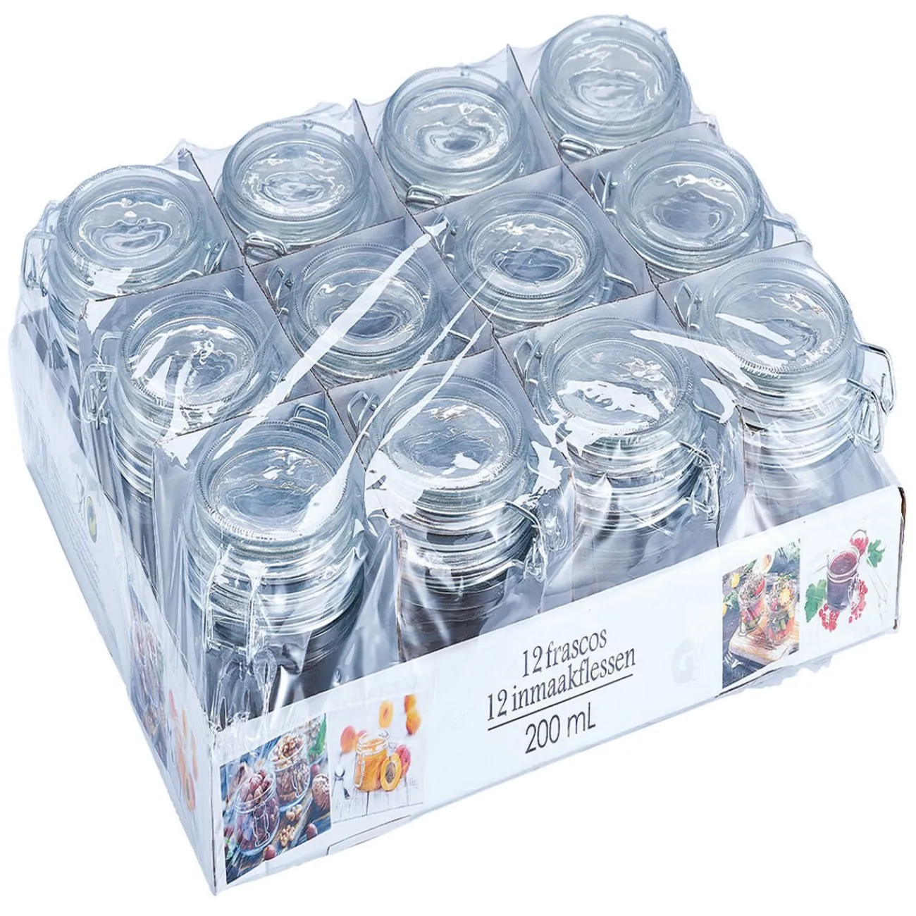 Lot de 12 bocaux en verre transparent et à fermeture hermétique.