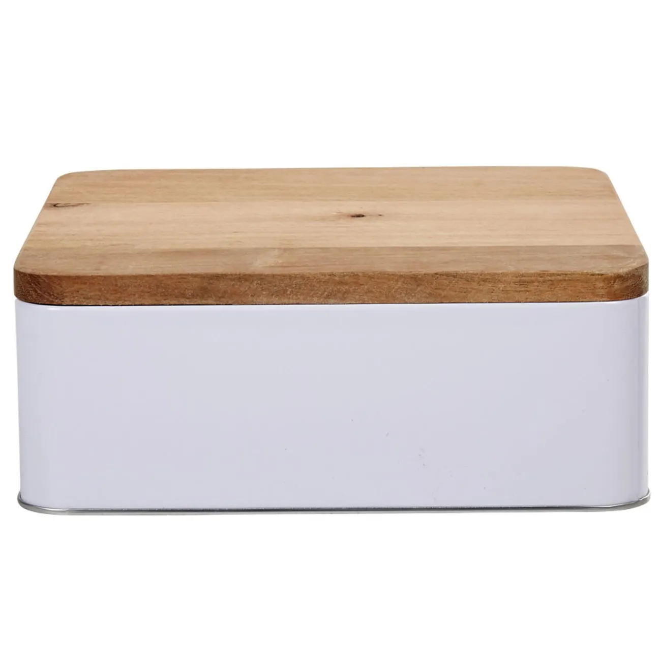 Boîte à biscuit rectangulaire en métal blanc avec couvercle en bois naturel.
