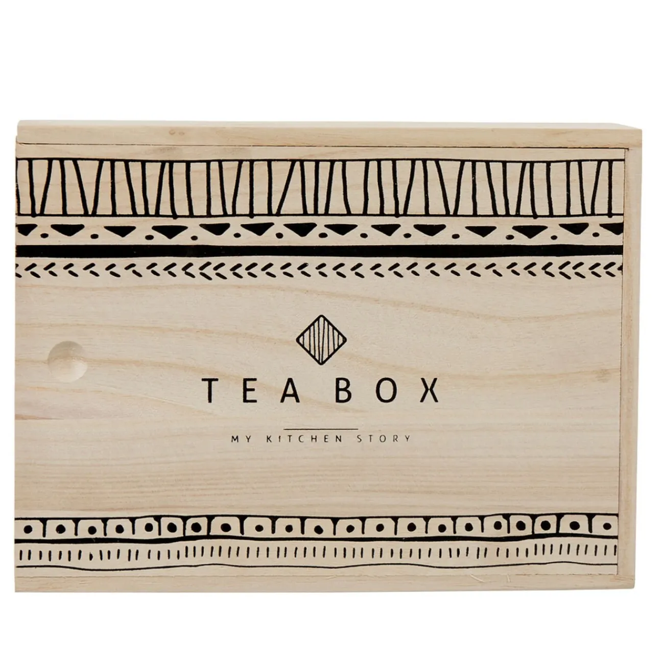 Optez pour cette jolie boîte à thé en bois MDF (panneau de fibres de bois) naturel avec couvercle coulissant imprimé déco noir. Elle somprend 8 compartiments pour la conservation optimale de vos différents thés.